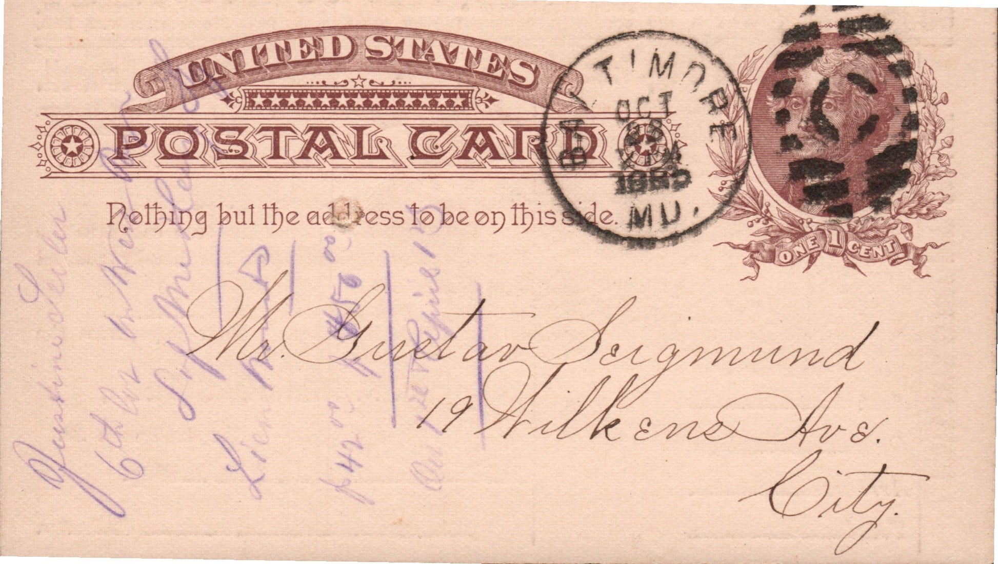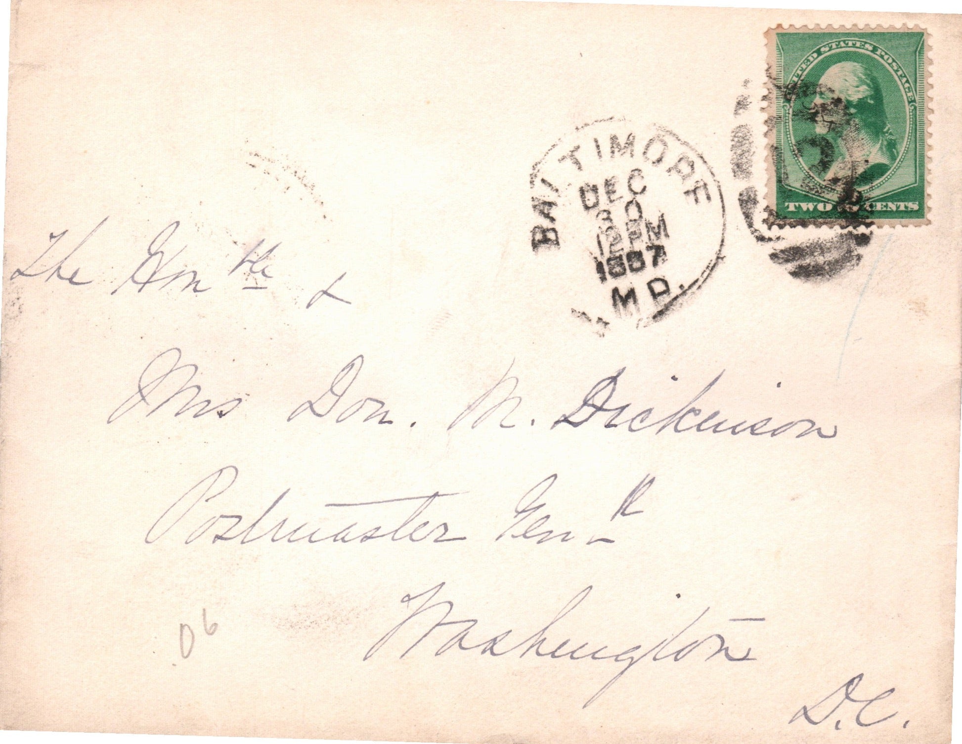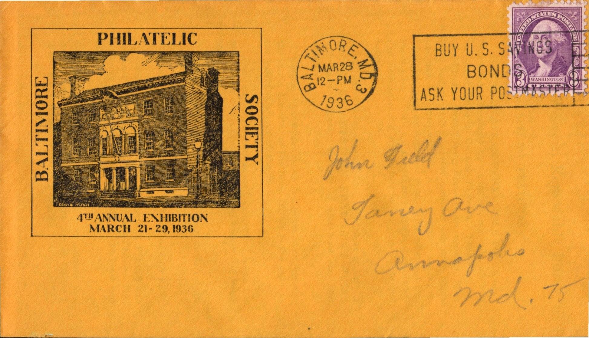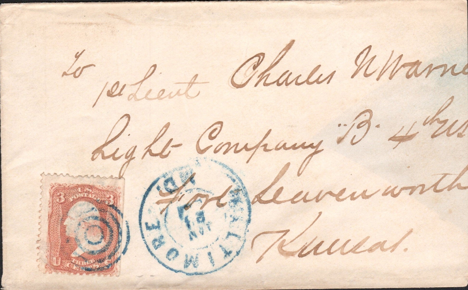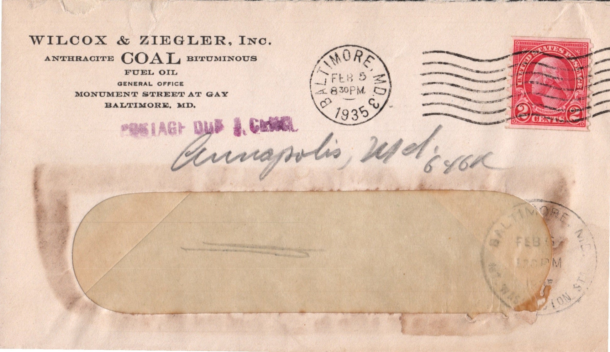 Baltimore c.1860s double circle and target killer on cover, military address; c.1870 cds on ratty cover, advertising on all margins and a picture of the U.S. Patent Office on the back; 1870s cds on all-over advertising cover, Baker Bros, Window Glass, - but front only; 1877 cds on cover, “John Stellman & Sons” corner; c.1880 duplex on small cover; 1885 duplex “C” on Postal Card, American Legion meeting information; 1880s duplex on cover, “W.H. Evans & Co.” corner; 1887 duplex “12” on cover; 1887 duplex “2” on cover, advertising for “Evans & Burnett’s Business College”; 1893 duple on Postal Card; 1896 machine cancel on cover, “Carlin & Fulton... Hardware, Cutlery and Guns” corner; 1896 machine cancel on Postal Card; 1897 duplex “1” on Postal Card; 1897 ,machine cancel on cover; 1899 machine cancel on toned cover, “N.T. Redman, Commission Merchant” corner and illustration of store; 1911 machine cancel on Postal Card “2C”, ad for”Kingan’s Meats”; 1912 machine cancel (4C) on Postal Card, ad for “J.J. Haines & Co., Wooden and Willow Ware and Floor Coverings”; 1918 machine slogan “Buy Now U.S. Government Bonds 3rd Liberty Loan” on post card; 1921 machine cancel on cover, “Wehr & Edwards Wholesale Lumber” corner; 1923 machine slogan “Better Homes Exposition” on post card [soldiers]; 1932 machine cancel on cover, “Railway Express Agency” corner; unreadable 1932 duplex on cover, “Young Men’s Boh. Dem. Club.” corner; 1933 machine cancel on window cover, “Bellair House Publishing” corner; 1933 machine cancel on cover, “Joseph L. Ruth, City Council” corner; 1933 machine cancel on cover, 1933 machine cancel on cover, “Poole Engineering & Machine Co.” corner; 1935 machine cancel on window cover, “Wilcox & Ziegler Coal” corner; 1936 Savings Bonds slogan on cacheted cover, Baltimore Philatelic Society”; 1943 machine slogan “Buy War Savings Bonds and Stamps” on tiny window cover; 1952 machine FD of 3¢ Rail Transportation stamp on cover; 1964 machine FD of 1 ct. Washington stamp on cacheted cover; “Baltimore MD precancel on 1960s Christmas stamp; 1969 1A machine slogan for Asthma Week on cover; 1969 2B machine cancel on cover