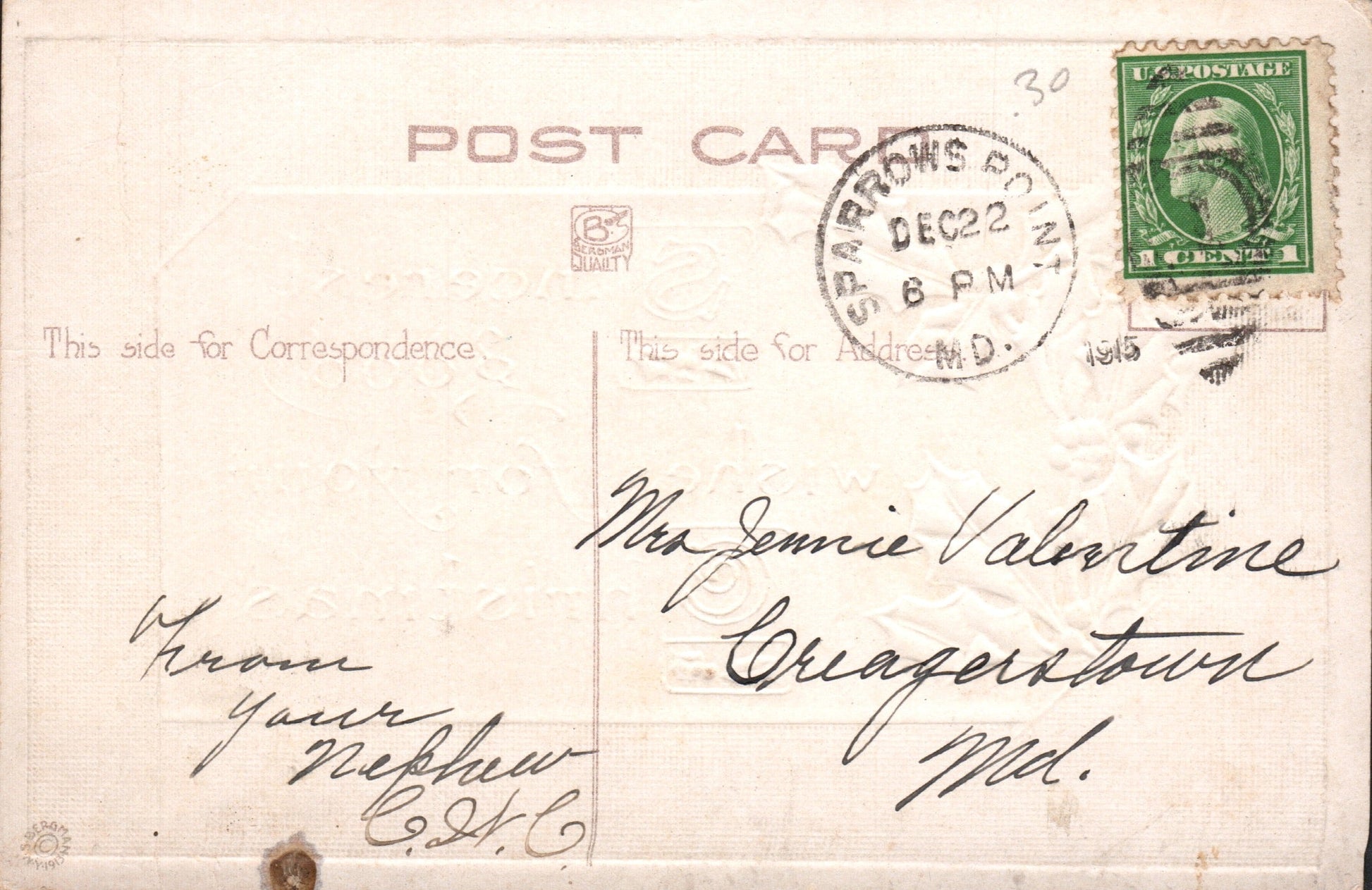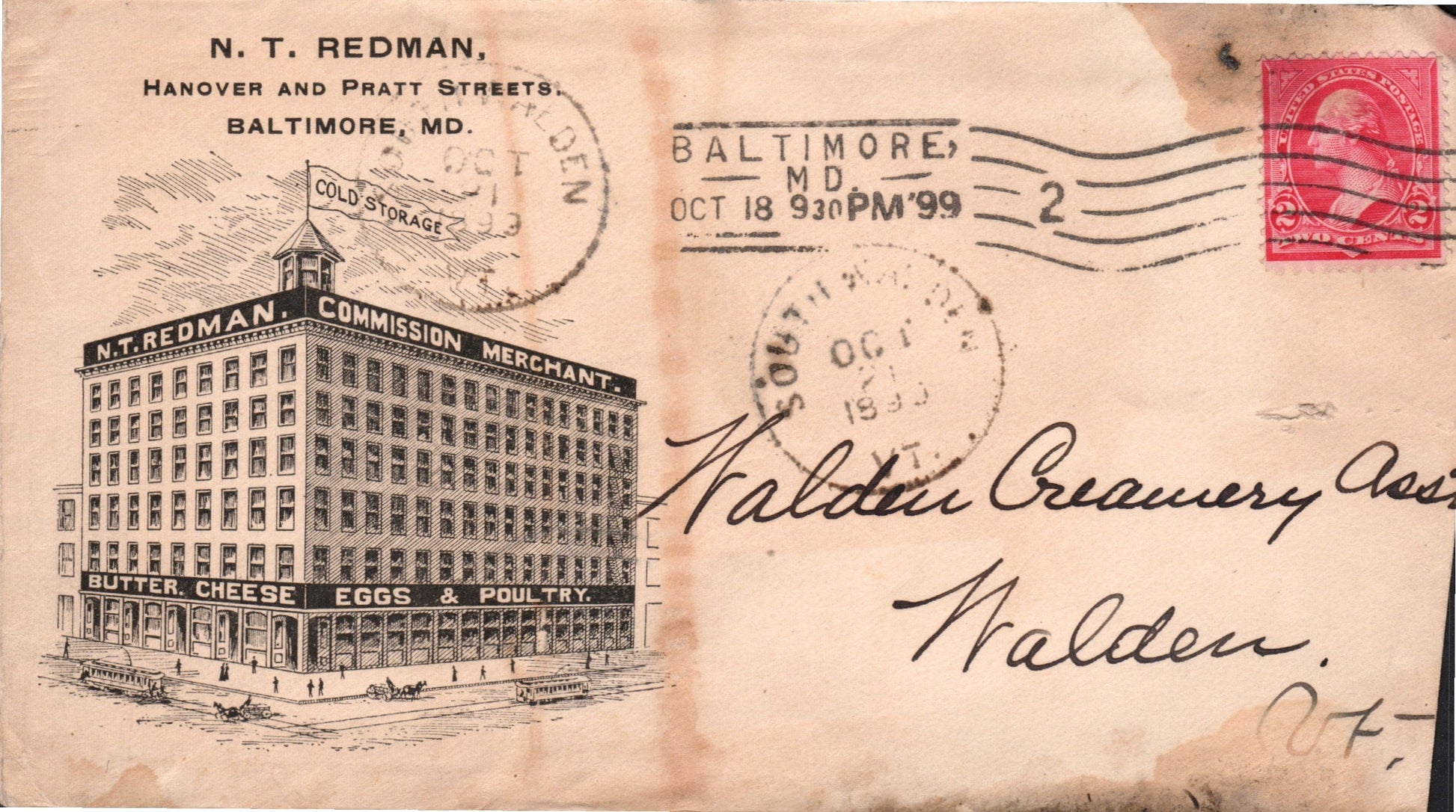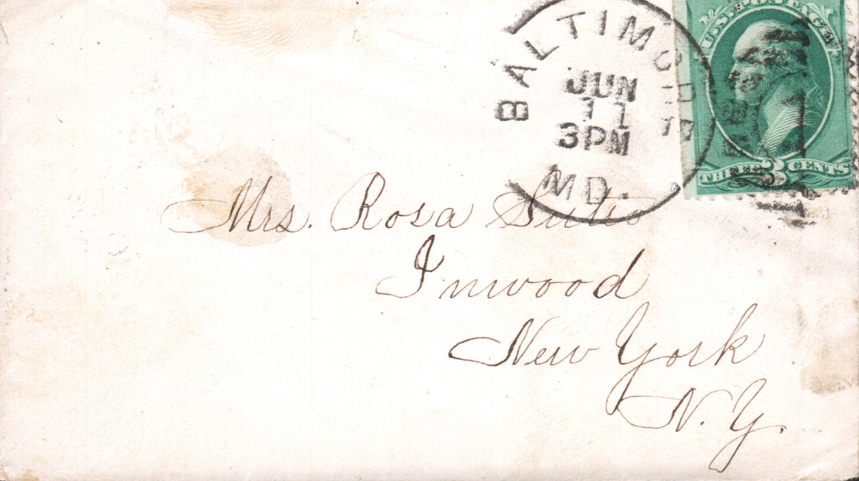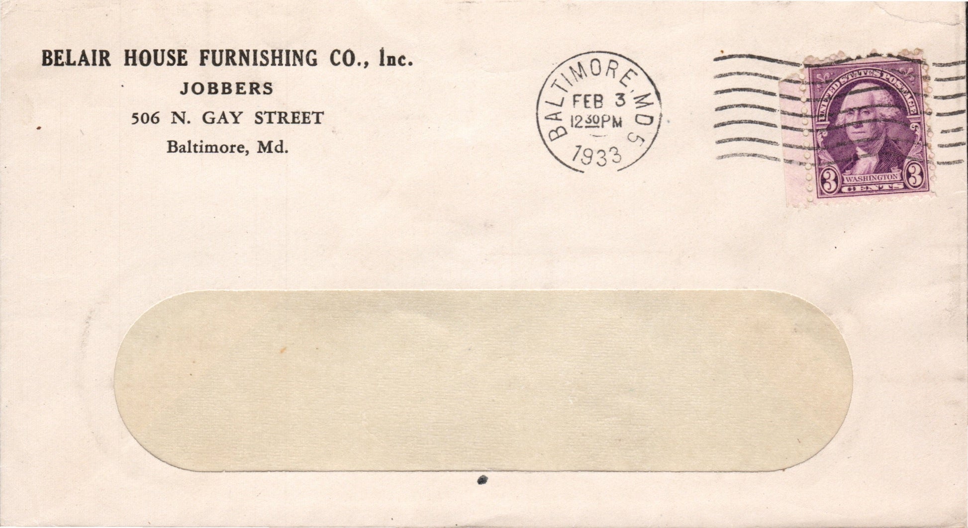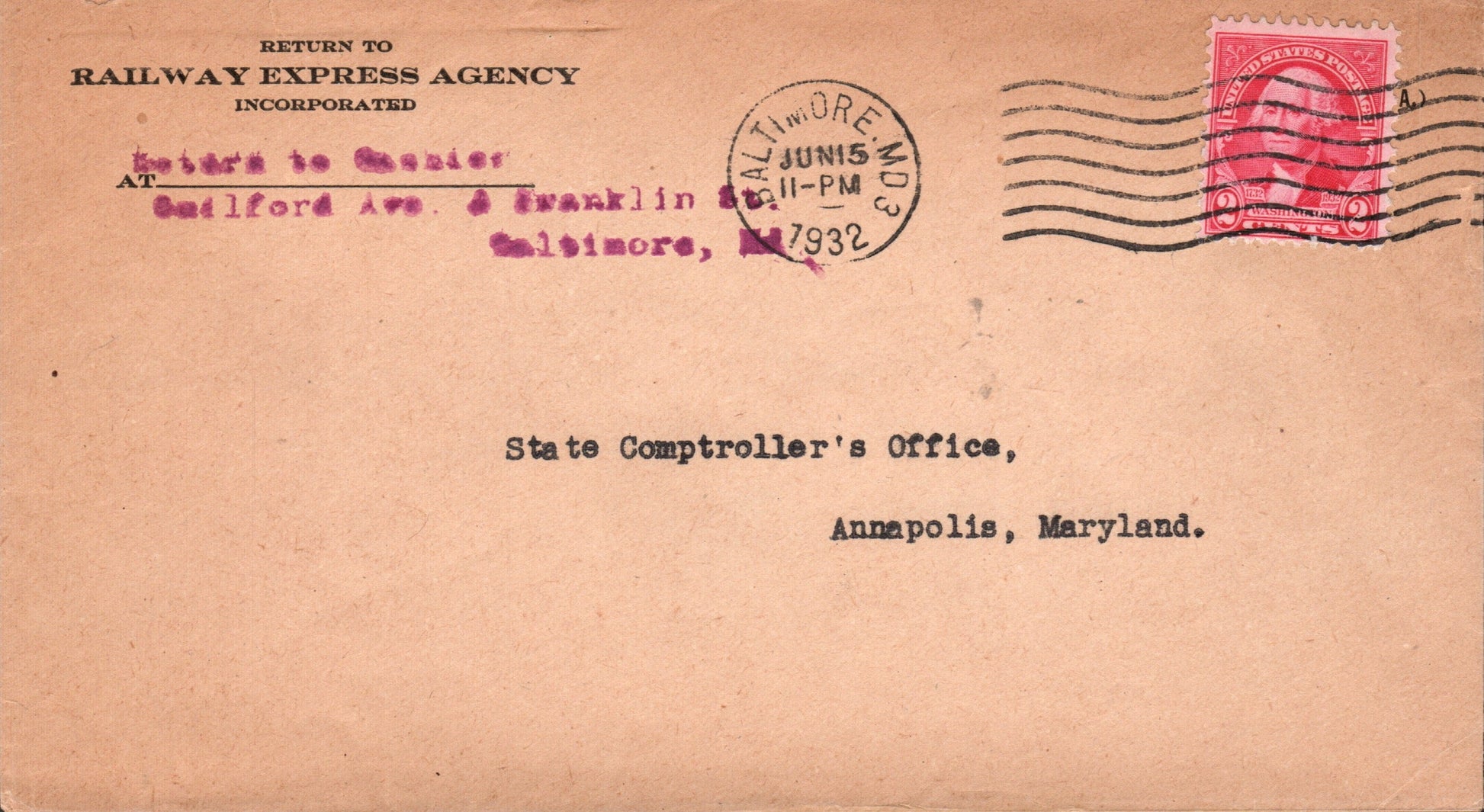 Baltimore c.1860s double circle and target killer on cover, military address; c.1870 cds on ratty cover, advertising on all margins and a picture of the U.S. Patent Office on the back; 1870s cds on all-over advertising cover, Baker Bros, Window Glass, - but front only; 1877 cds on cover, “John Stellman & Sons” corner; c.1880 duplex on small cover; 1885 duplex “C” on Postal Card, American Legion meeting information; 1880s duplex on cover, “W.H. Evans & Co.” corner; 1887 duplex “12” on cover; 1887 duplex “2” on cover, advertising for “Evans & Burnett’s Business College”; 1893 duple on Postal Card; 1896 machine cancel on cover, “Carlin & Fulton... Hardware, Cutlery and Guns” corner; 1896 machine cancel on Postal Card; 1897 duplex “1” on Postal Card; 1897 ,machine cancel on cover; 1899 machine cancel on toned cover, “N.T. Redman, Commission Merchant” corner and illustration of store; 1911 machine cancel on Postal Card “2C”, ad for”Kingan’s Meats”; 1912 machine cancel (4C) on Postal Card, ad for “J.J. Haines & Co., Wooden and Willow Ware and Floor Coverings”; 1918 machine slogan “Buy Now U.S. Government Bonds 3rd Liberty Loan” on post card; 1921 machine cancel on cover, “Wehr & Edwards Wholesale Lumber” corner; 1923 machine slogan “Better Homes Exposition” on post card [soldiers]; 1932 machine cancel on cover, “Railway Express Agency” corner; unreadable 1932 duplex on cover, “Young Men’s Boh. Dem. Club.” corner; 1933 machine cancel on window cover, “Bellair House Publishing” corner; 1933 machine cancel on cover, “Joseph L. Ruth, City Council” corner; 1933 machine cancel on cover, 1933 machine cancel on cover, “Poole Engineering & Machine Co.” corner; 1935 machine cancel on window cover, “Wilcox & Ziegler Coal” corner; 1936 Savings Bonds slogan on cacheted cover, Baltimore Philatelic Society”; 1943 machine slogan “Buy War Savings Bonds and Stamps” on tiny window cover; 1952 machine FD of 3¢ Rail Transportation stamp on cover; 1964 machine FD of 1 ct. Washington stamp on cacheted cover; “Baltimore MD precancel on 1960s Christmas stamp; 1969 1A machine slogan for Asthma Week on cover; 1969 2B machine cancel on cover