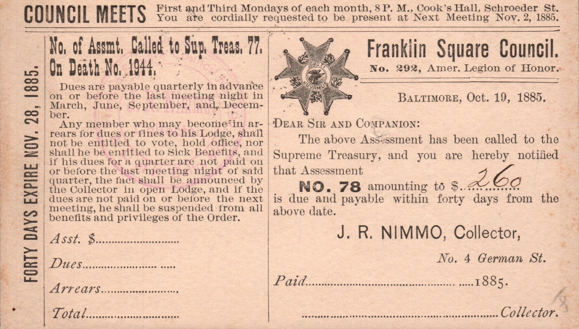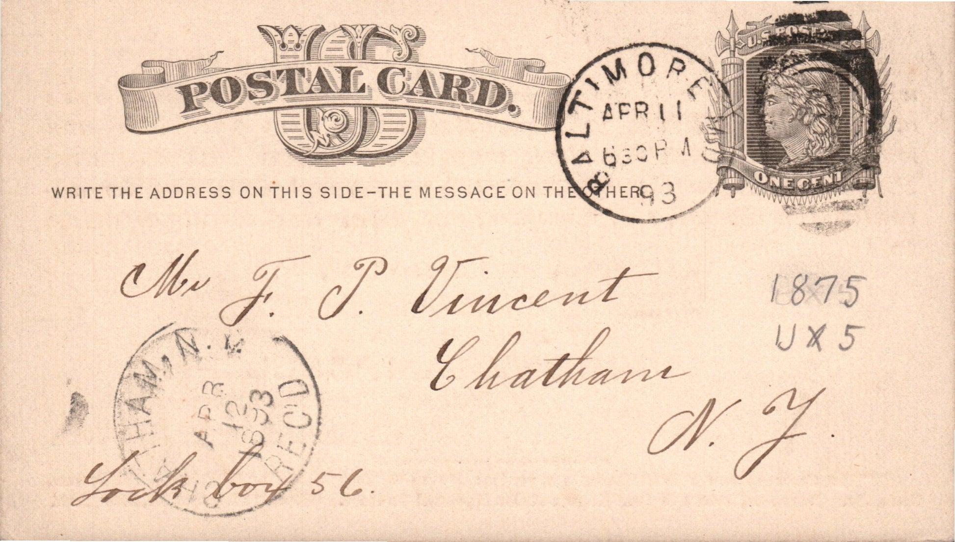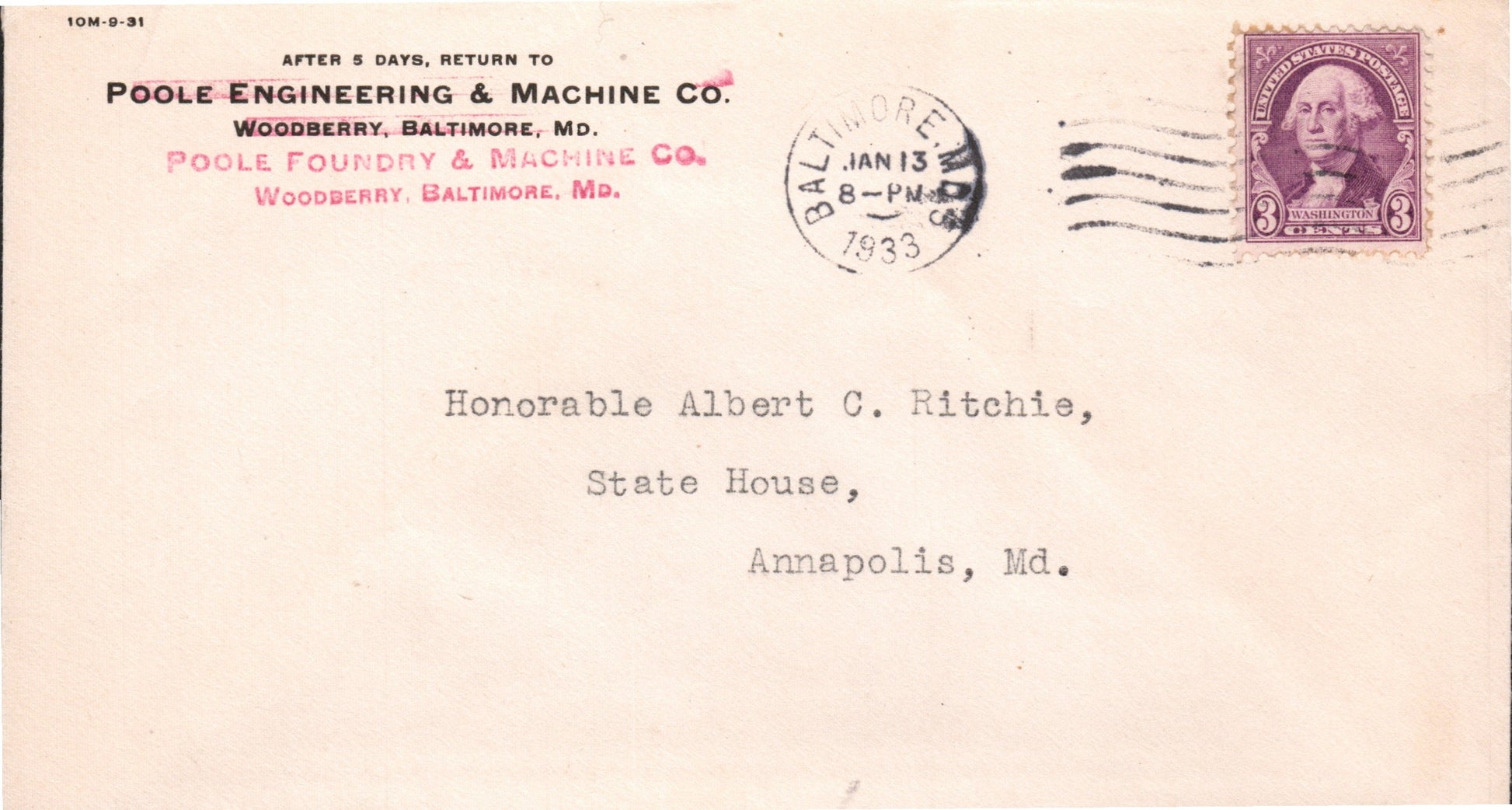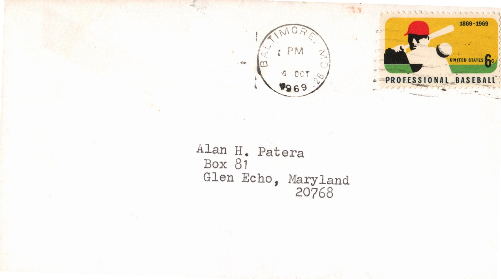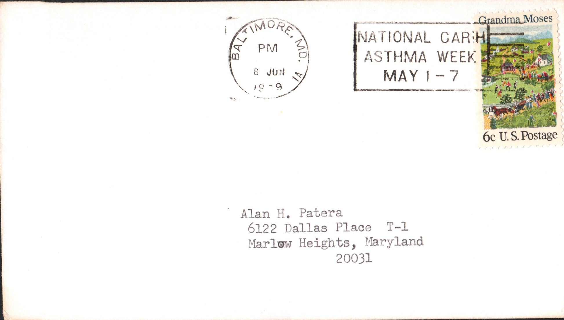 Baltimore c.1860s double circle and target killer on cover, military address; c.1870 cds on ratty cover, advertising on all margins and a picture of the U.S. Patent Office on the back; 1870s cds on all-over advertising cover, Baker Bros, Window Glass, - but front only; 1877 cds on cover, “John Stellman & Sons” corner; c.1880 duplex on small cover; 1885 duplex “C” on Postal Card, American Legion meeting information; 1880s duplex on cover, “W.H. Evans & Co.” corner; 1887 duplex “12” on cover; 1887 duplex “2” on cover, advertising for “Evans & Burnett’s Business College”; 1893 duple on Postal Card; 1896 machine cancel on cover, “Carlin & Fulton... Hardware, Cutlery and Guns” corner; 1896 machine cancel on Postal Card; 1897 duplex “1” on Postal Card; 1897 ,machine cancel on cover; 1899 machine cancel on toned cover, “N.T. Redman, Commission Merchant” corner and illustration of store; 1911 machine cancel on Postal Card “2C”, ad for”Kingan’s Meats”; 1912 machine cancel (4C) on Postal Card, ad for “J.J. Haines & Co., Wooden and Willow Ware and Floor Coverings”; 1918 machine slogan “Buy Now U.S. Government Bonds 3rd Liberty Loan” on post card; 1921 machine cancel on cover, “Wehr & Edwards Wholesale Lumber” corner; 1923 machine slogan “Better Homes Exposition” on post card [soldiers]; 1932 machine cancel on cover, “Railway Express Agency” corner; unreadable 1932 duplex on cover, “Young Men’s Boh. Dem. Club.” corner; 1933 machine cancel on window cover, “Bellair House Publishing” corner; 1933 machine cancel on cover, “Joseph L. Ruth, City Council” corner; 1933 machine cancel on cover, 1933 machine cancel on cover, “Poole Engineering & Machine Co.” corner; 1935 machine cancel on window cover, “Wilcox & Ziegler Coal” corner; 1936 Savings Bonds slogan on cacheted cover, Baltimore Philatelic Society”; 1943 machine slogan “Buy War Savings Bonds and Stamps” on tiny window cover; 1952 machine FD of 3¢ Rail Transportation stamp on cover; 1964 machine FD of 1 ct. Washington stamp on cacheted cover; “Baltimore MD precancel on 1960s Christmas stamp; 1969 1A machine slogan for Asthma Week on cover; 1969 2B machine cancel on cover