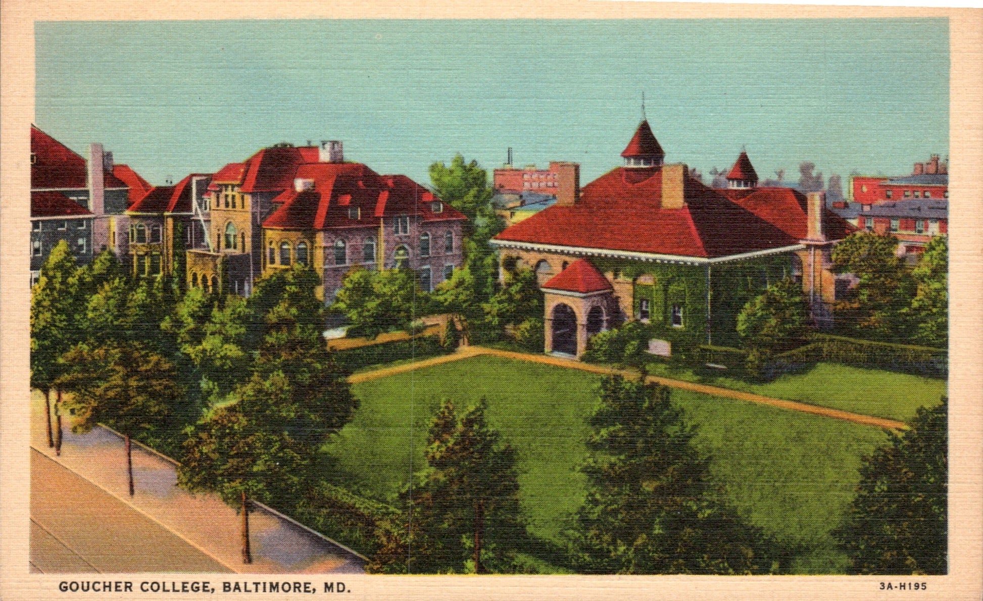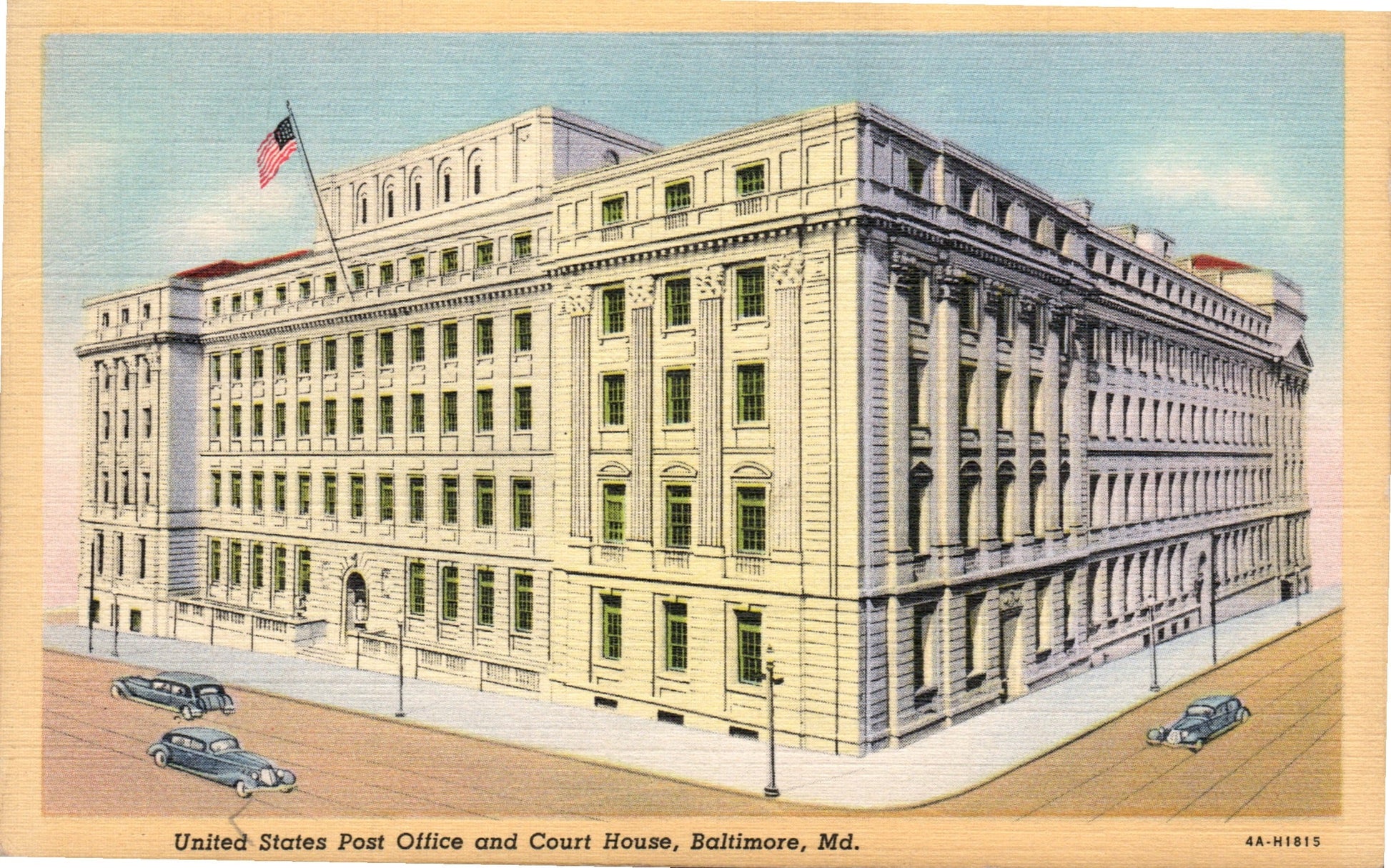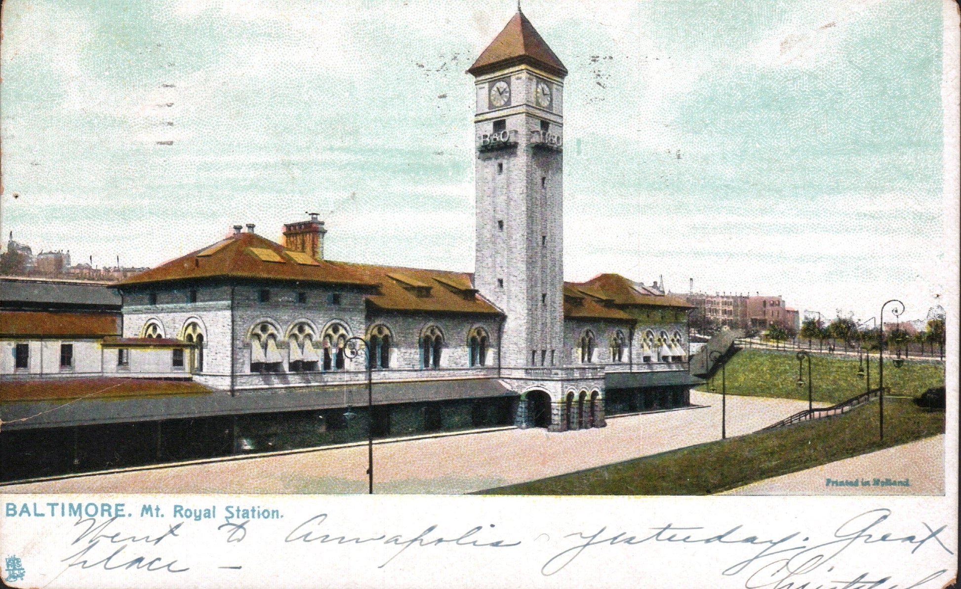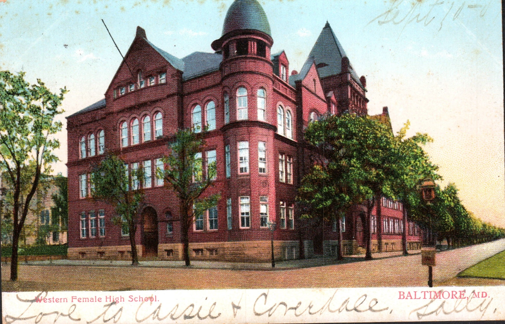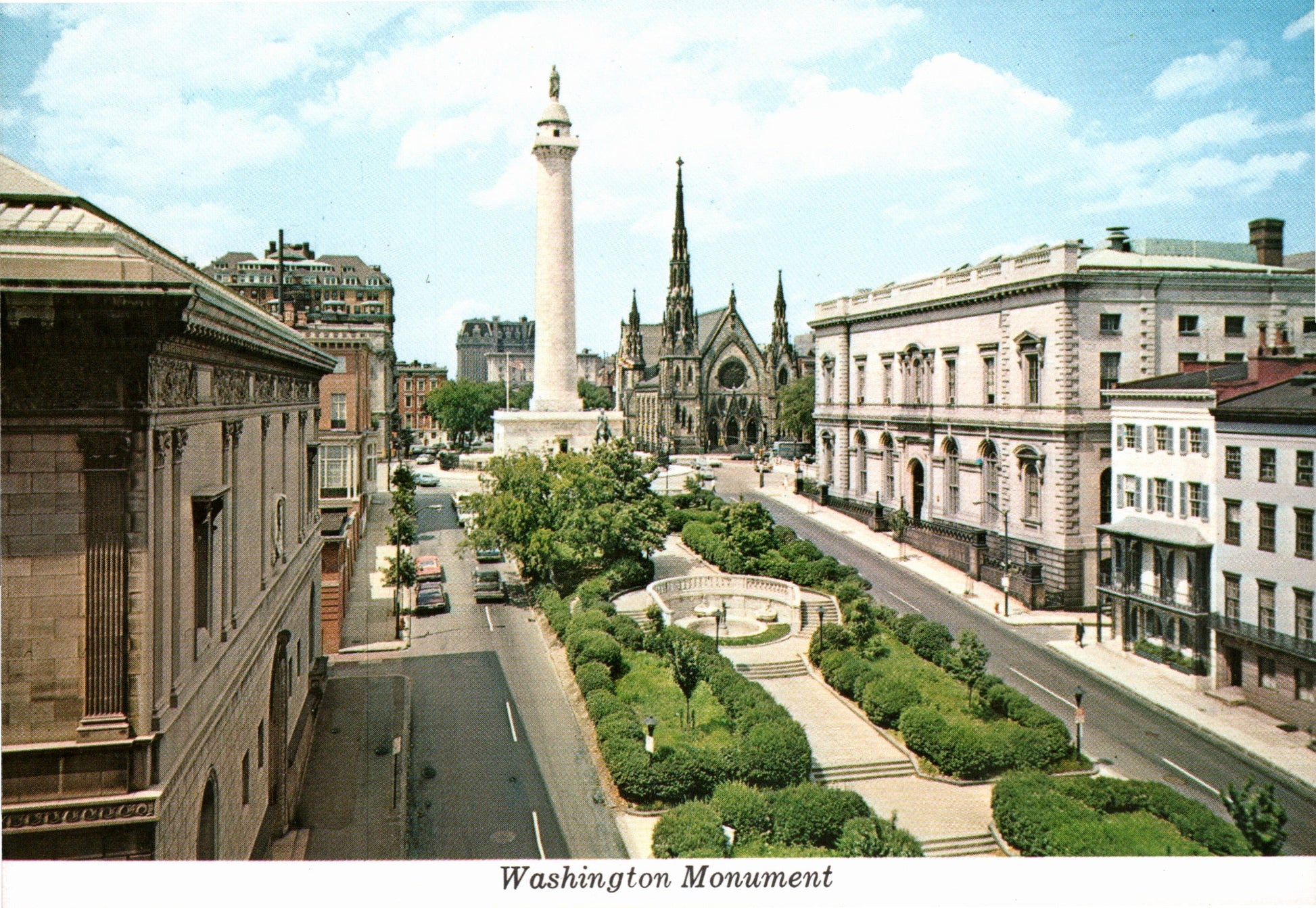 Post cards: “Mount Vernon Place” [Continental]; Baltimore and Ohio building [c.1910]; Lexington Market [1926]; “Mt. Royal Station” (RR) [1908]; “New Court House” [c.1910]; “War Memorial and Plaza” [linen]; “Haussner’s Restaurant” [2 chrome views of paintings]; “Johns Hopkins Hospital” [linen]; Johns Hopkins aerial view [linen]; “Post office and Court House” [linen]; Fifth Regiment Armory [1924]; Eastern High School [c.1910]; “Western Female High School” [1907]; “Goucher College” [linen]; “Enoch Pratt Free Library” [chrome]; “The Cathedral” [3 views, 1907 Transfer Clerk Camden Sta. cds, 1910, linen]; Goucher College Memorial Chapel [chrome]; “Francis Scott Key Monument” [2 views, one linen, one chrome 1983, postal markings on picture]; “Evergreen House” [3 views, two exterior and one interior, all chrome]; “Flag House” [chrome, 1956]; “Fort McHenry”[7 chrome cards, one aerial view, one linen, 3 are Continental]; “Hanover Street Bridge” [linen]; Bay Shore Park with crowd [1909]; Druid Hill Park [1907]