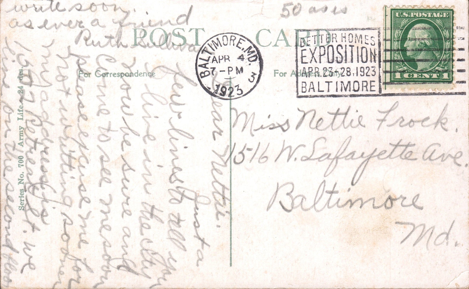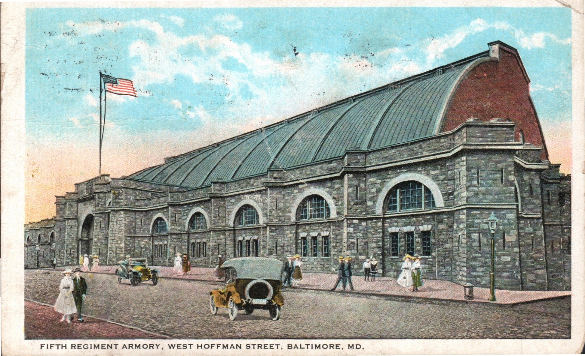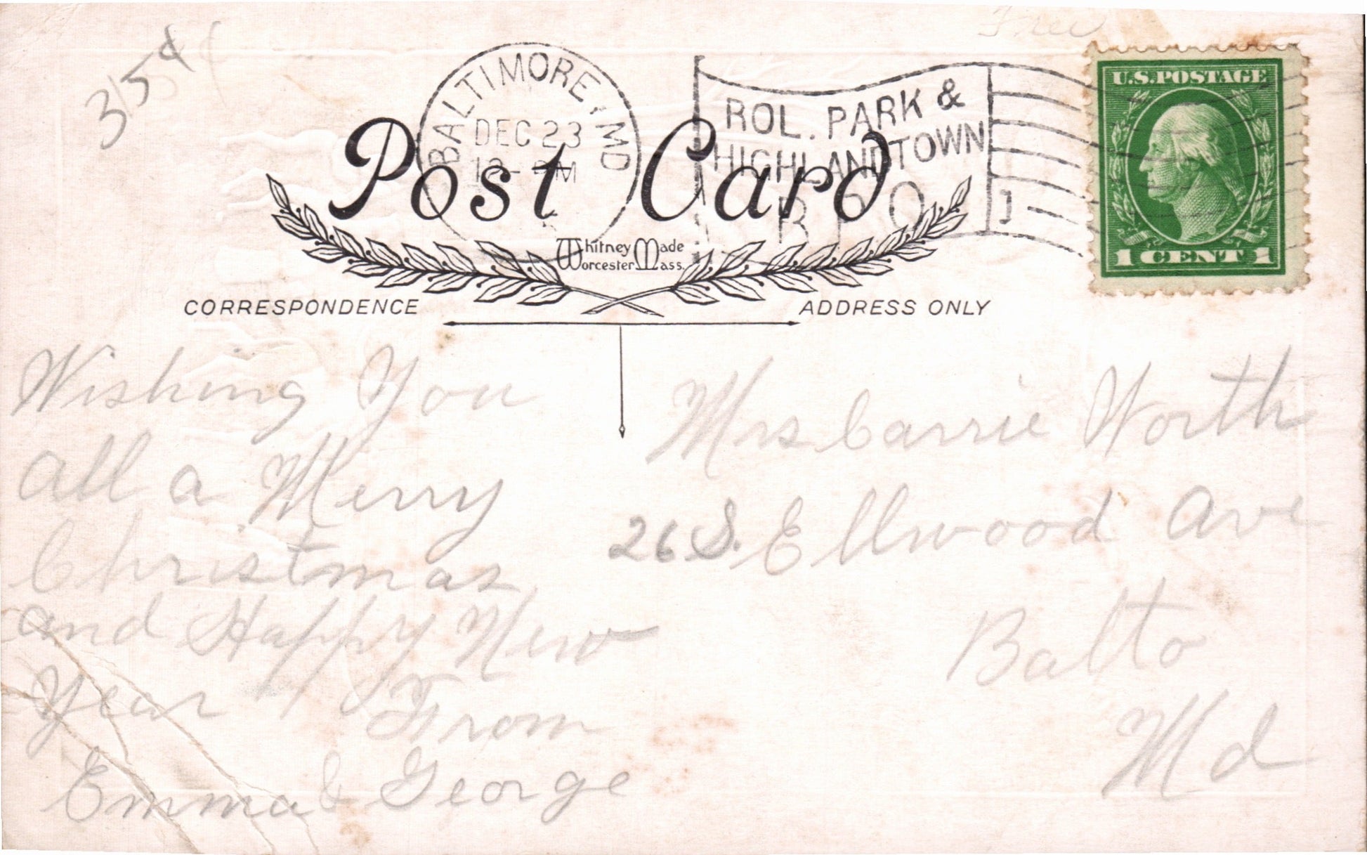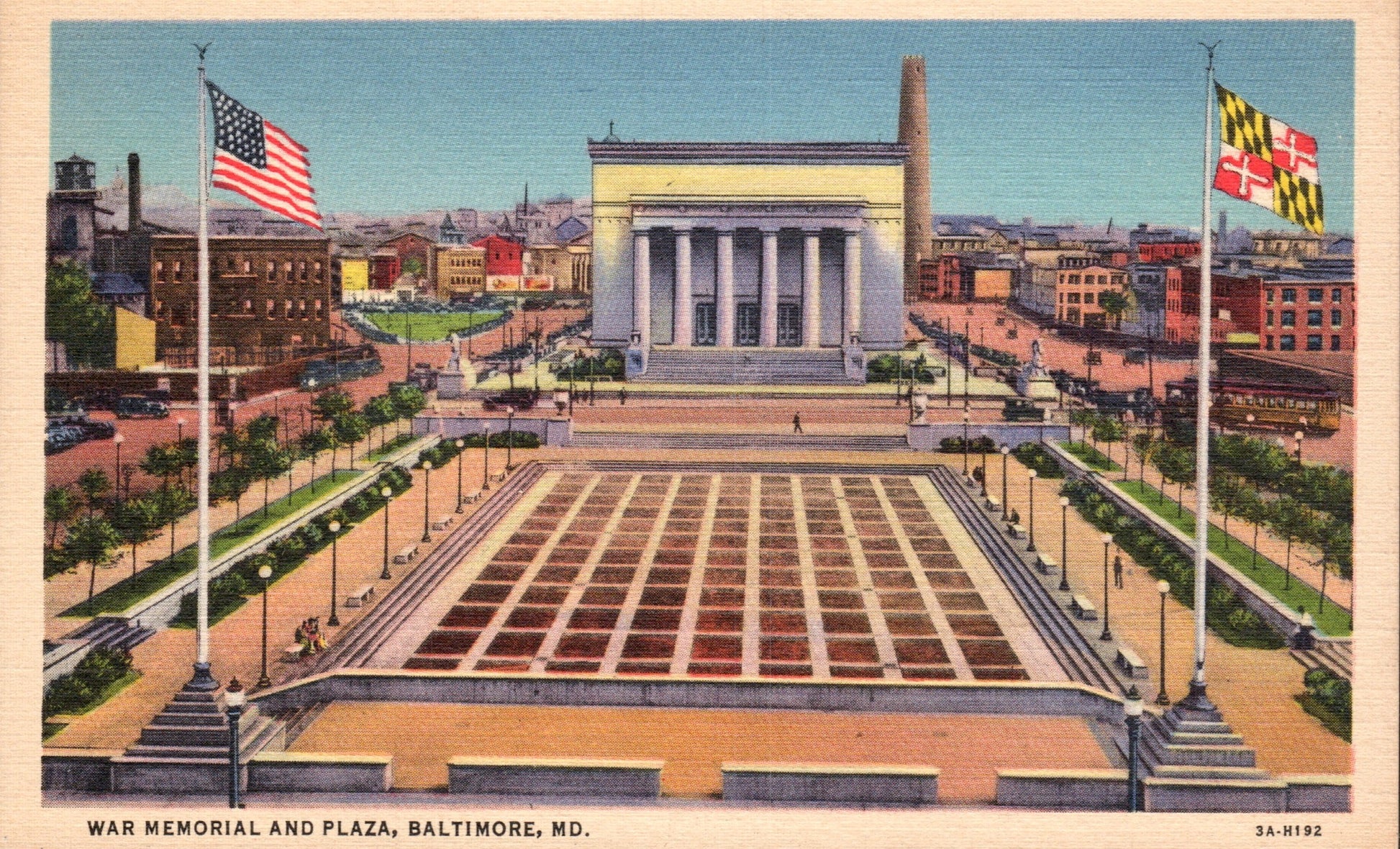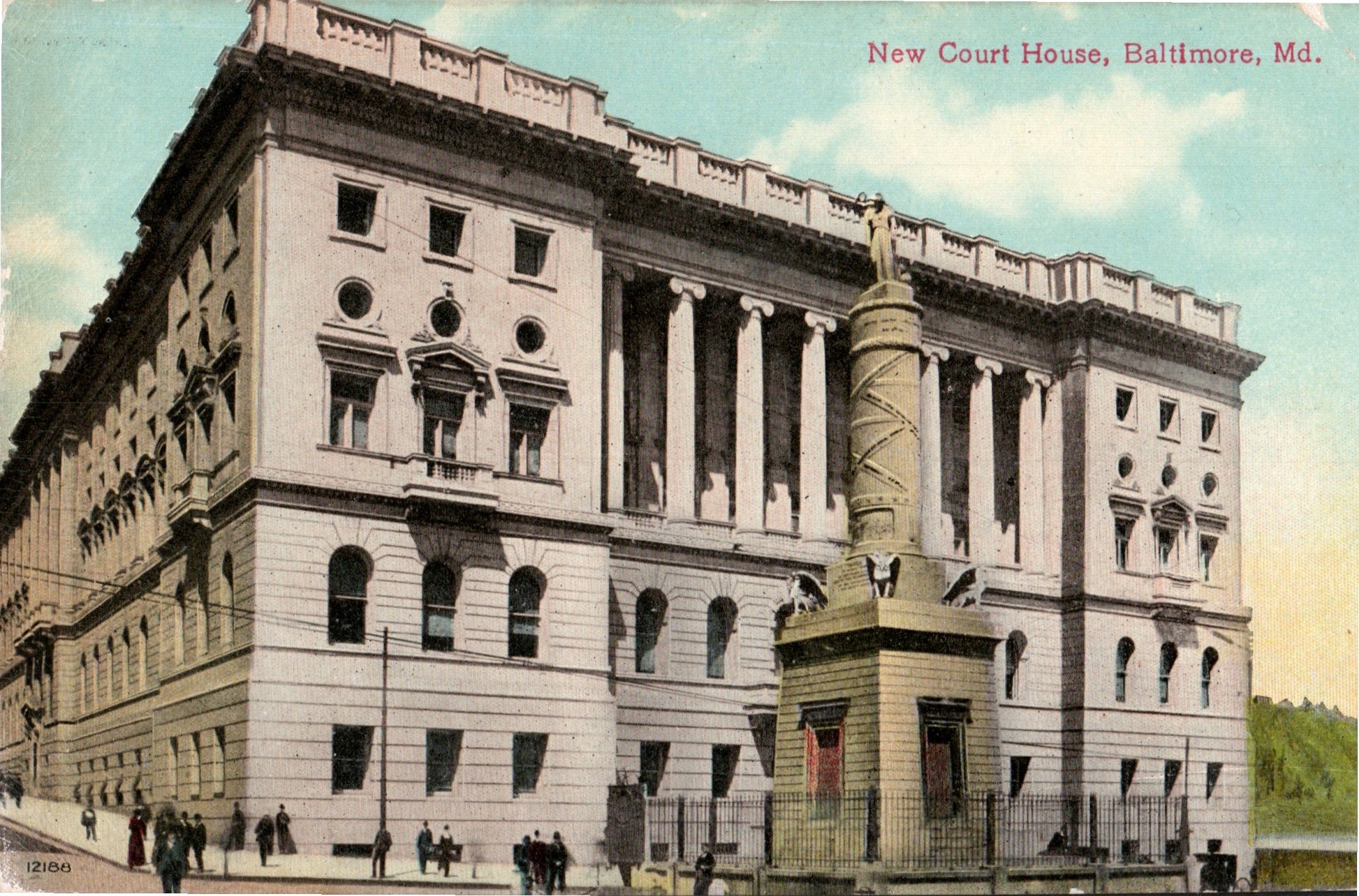 Post cards: “Mount Vernon Place” [Continental]; Baltimore and Ohio building [c.1910]; Lexington Market [1926]; “Mt. Royal Station” (RR) [1908]; “New Court House” [c.1910]; “War Memorial and Plaza” [linen]; “Haussner’s Restaurant” [2 chrome views of paintings]; “Johns Hopkins Hospital” [linen]; Johns Hopkins aerial view [linen]; “Post office and Court House” [linen]; Fifth Regiment Armory [1924]; Eastern High School [c.1910]; “Western Female High School” [1907]; “Goucher College” [linen]; “Enoch Pratt Free Library” [chrome]; “The Cathedral” [3 views, 1907 Transfer Clerk Camden Sta. cds, 1910, linen]; Goucher College Memorial Chapel [chrome]; “Francis Scott Key Monument” [2 views, one linen, one chrome 1983, postal markings on picture]; “Evergreen House” [3 views, two exterior and one interior, all chrome]; “Flag House” [chrome, 1956]; “Fort McHenry”[7 chrome cards, one aerial view, one linen, 3 are Continental]; “Hanover Street Bridge” [linen]; Bay Shore Park with crowd [1909]; Druid Hill Park [1907]