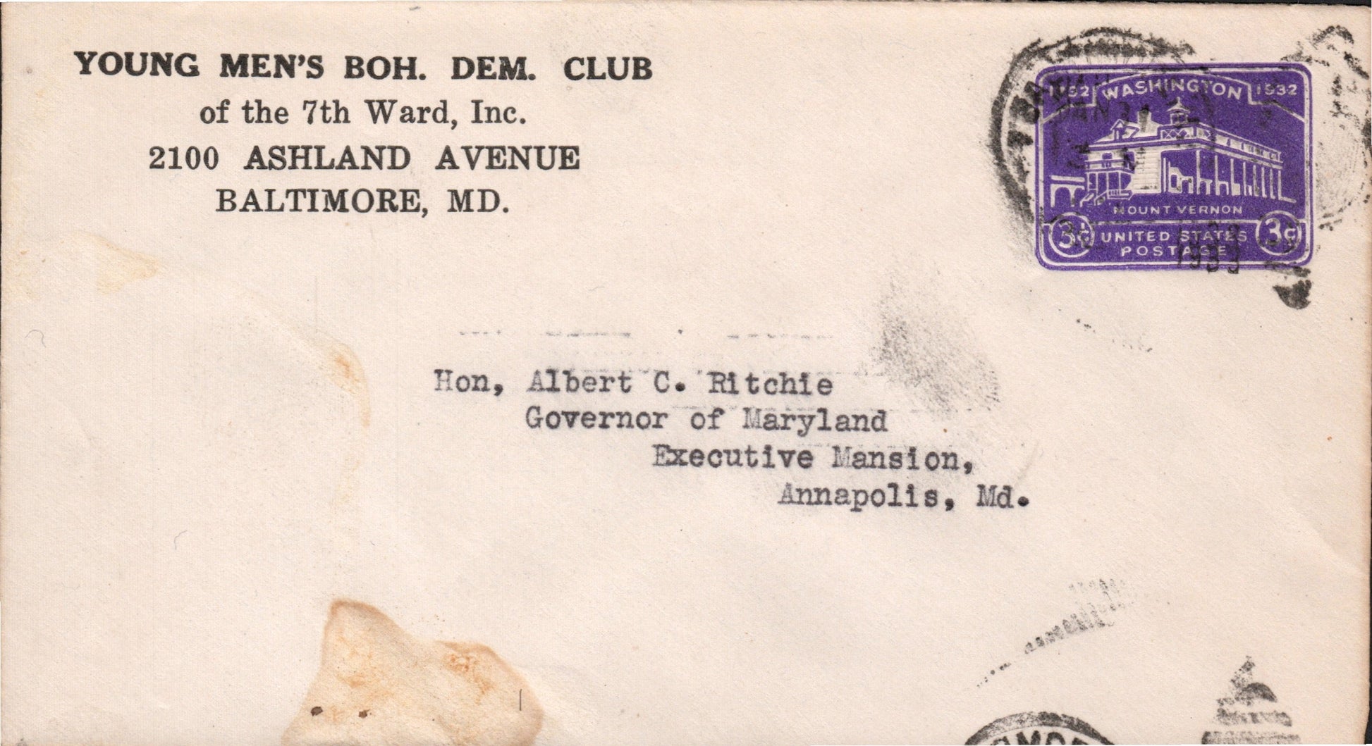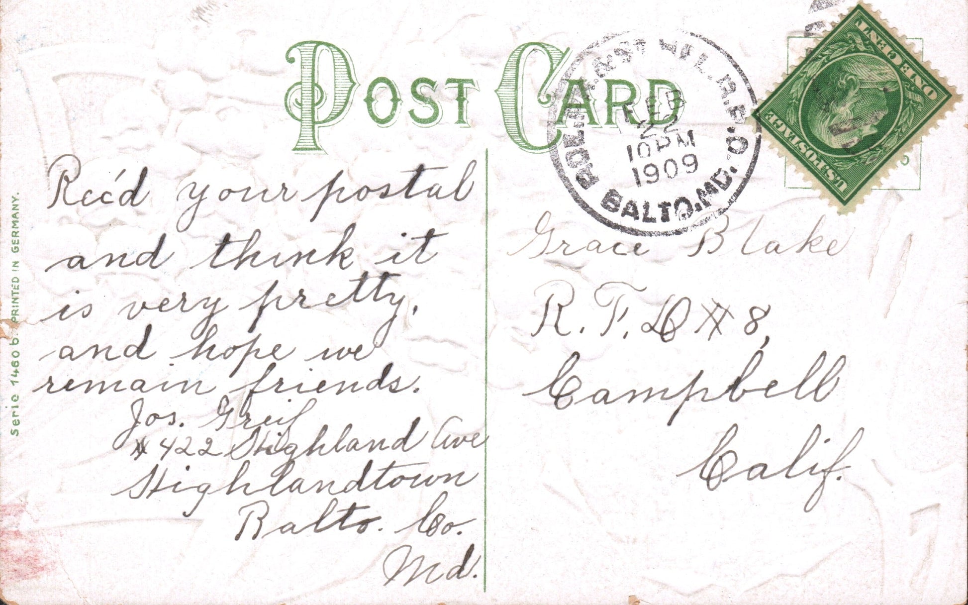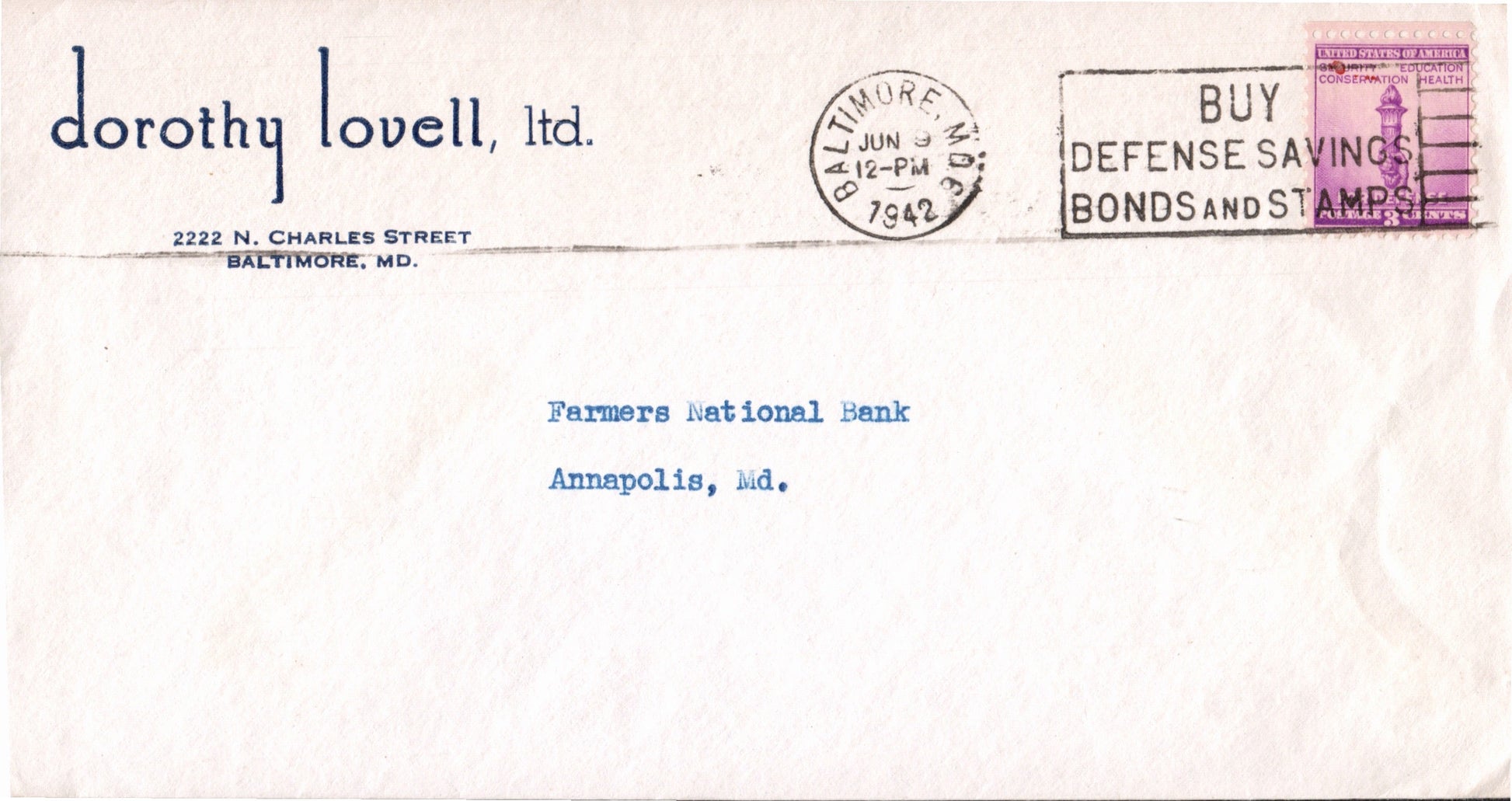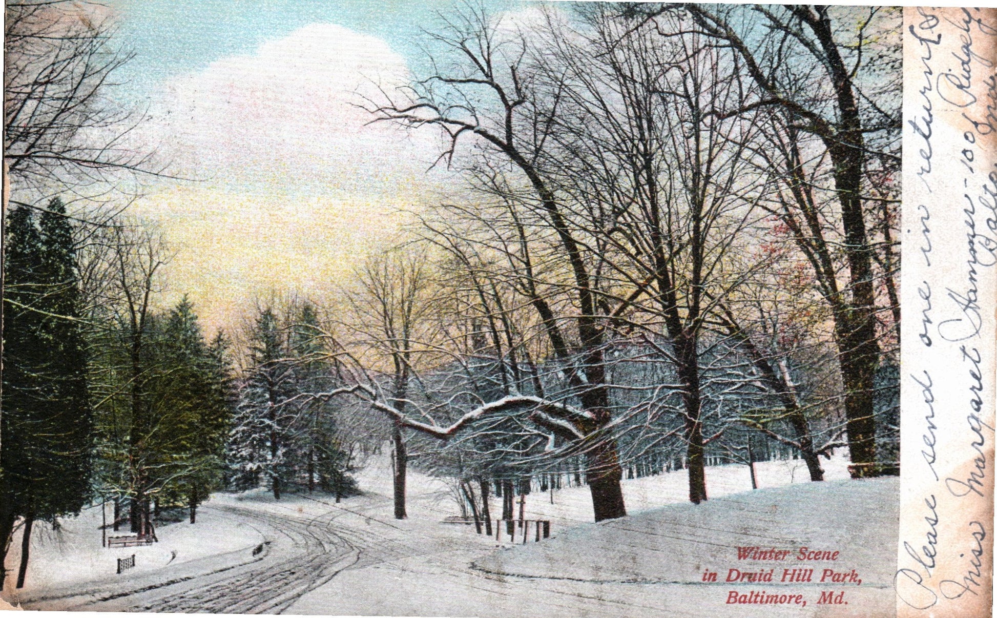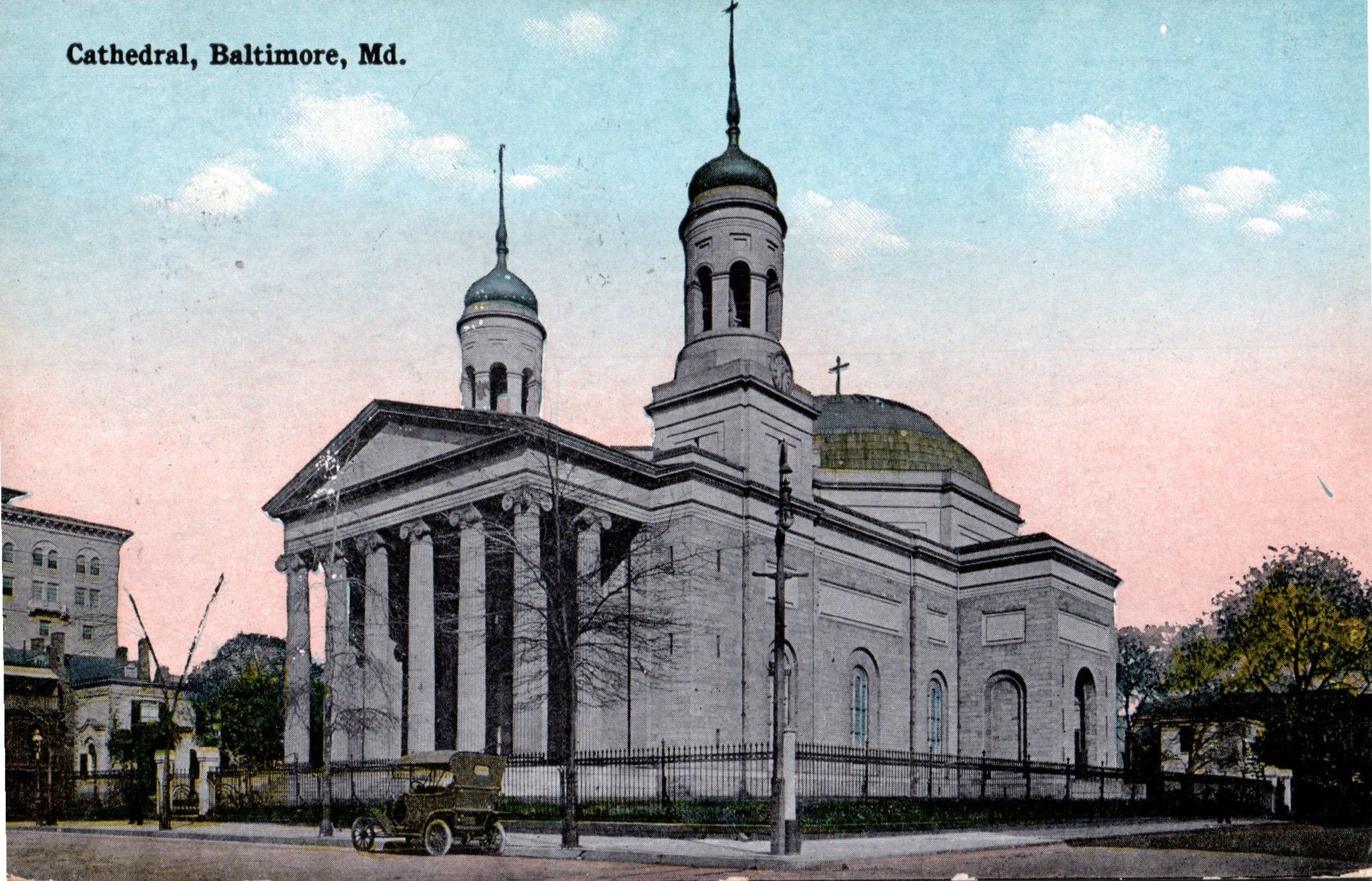 Post cards: “Mount Vernon Place” [Continental]; Baltimore and Ohio building [c.1910]; Lexington Market [1926]; “Mt. Royal Station” (RR) [1908]; “New Court House” [c.1910]; “War Memorial and Plaza” [linen]; “Haussner’s Restaurant” [2 chrome views of paintings]; “Johns Hopkins Hospital” [linen]; Johns Hopkins aerial view [linen]; “Post office and Court House” [linen]; Fifth Regiment Armory [1924]; Eastern High School [c.1910]; “Western Female High School” [1907]; “Goucher College” [linen]; “Enoch Pratt Free Library” [chrome]; “The Cathedral” [3 views, 1907 Transfer Clerk Camden Sta. cds, 1910, linen]; Goucher College Memorial Chapel [chrome]; “Francis Scott Key Monument” [2 views, one linen, one chrome 1983, postal markings on picture]; “Evergreen House” [3 views, two exterior and one interior, all chrome]; “Flag House” [chrome, 1956]; “Fort McHenry”[7 chrome cards, one aerial view, one linen, 3 are Continental]; “Hanover Street Bridge” [linen]; Bay Shore Park with crowd [1909]; Druid Hill Park [1907]