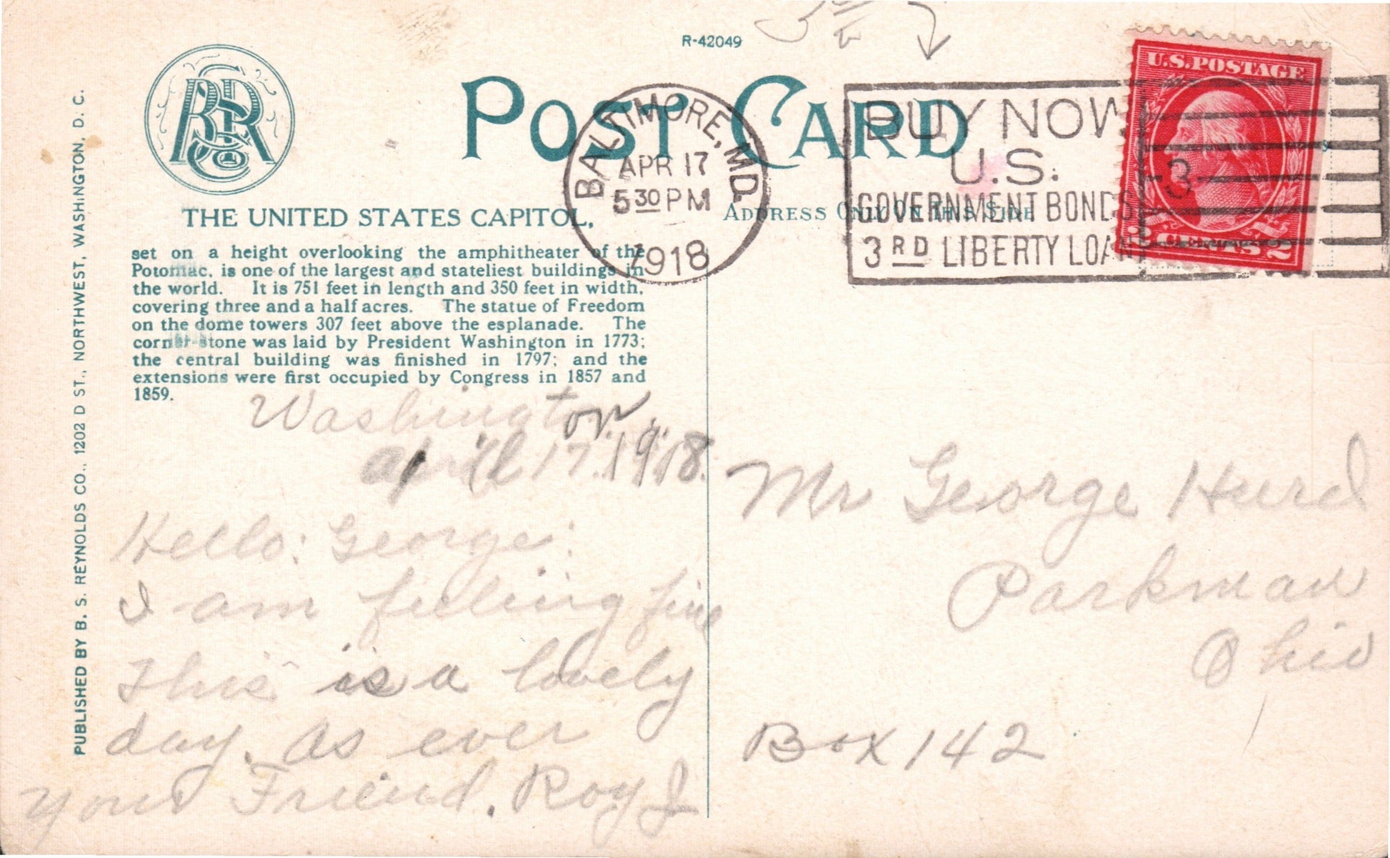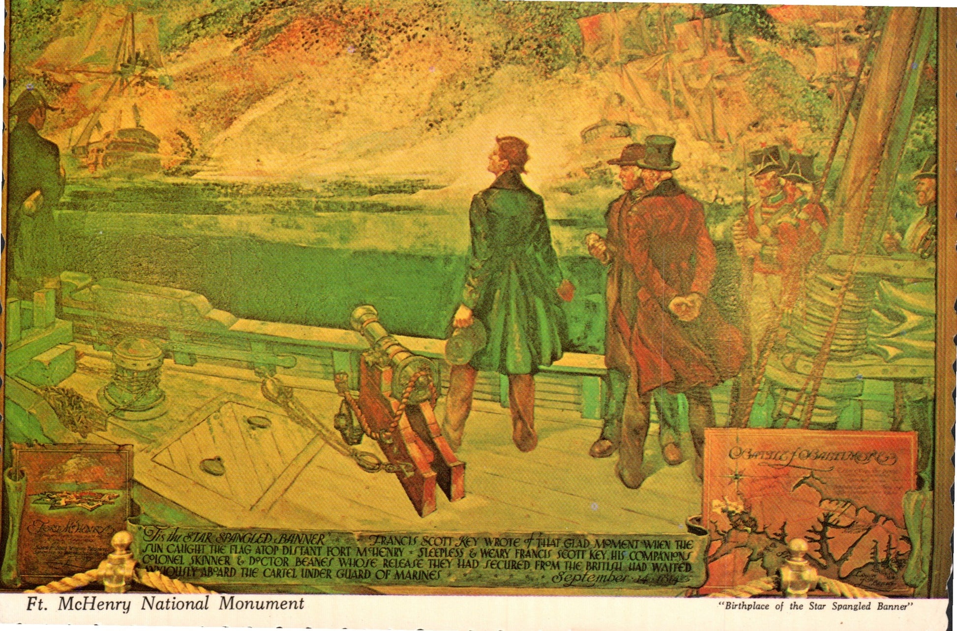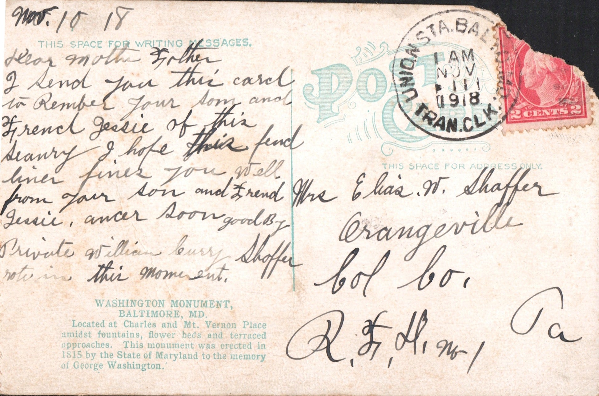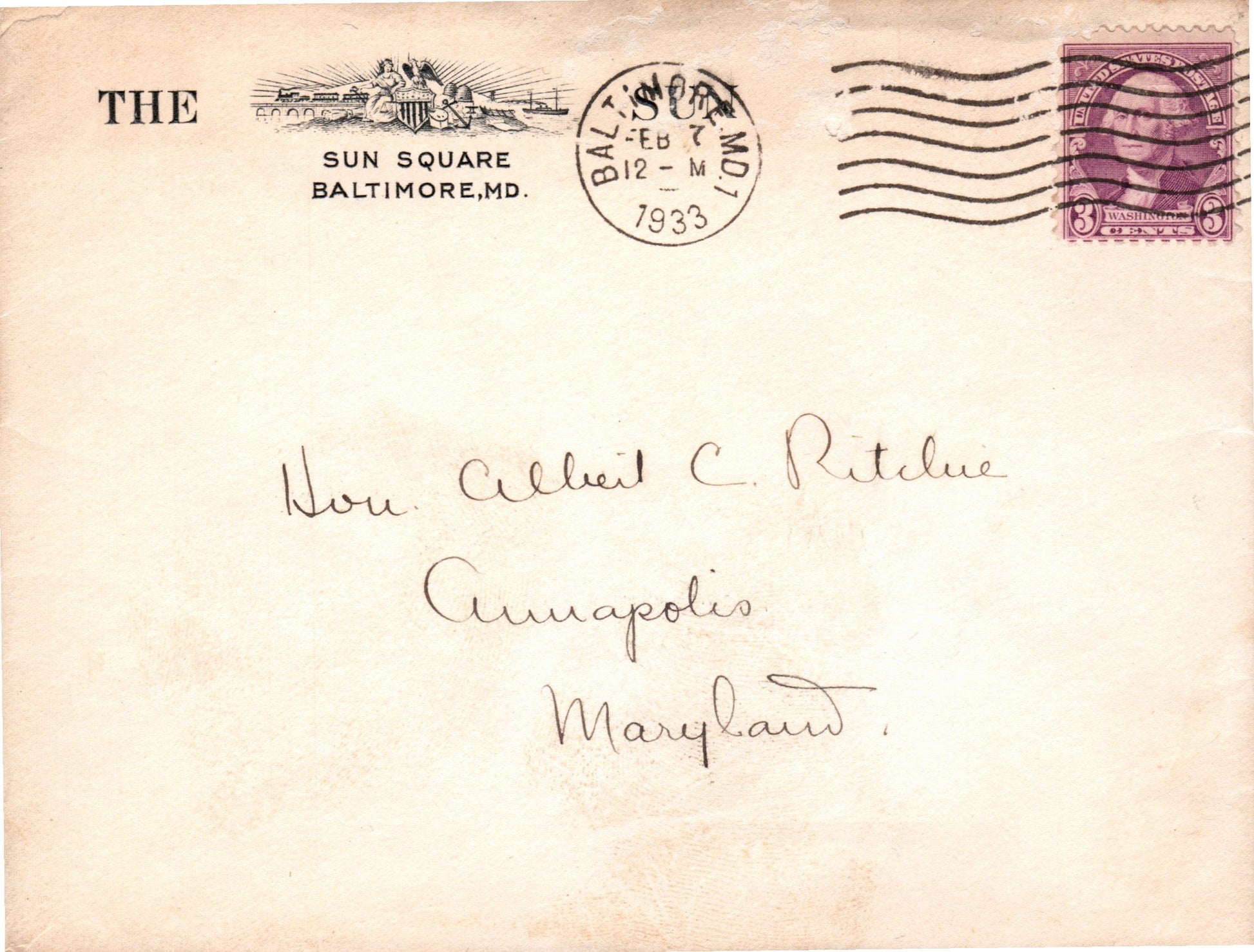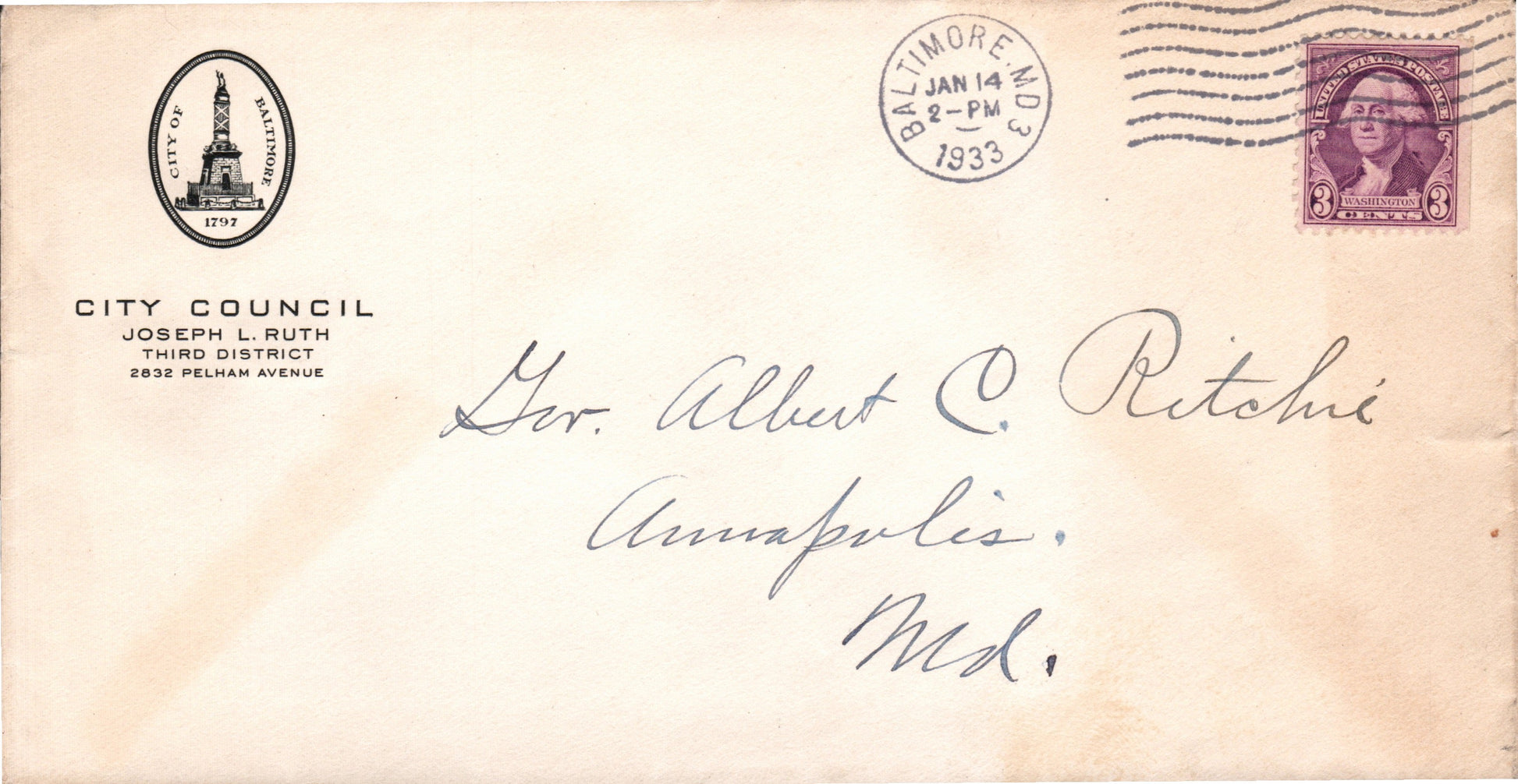 Post cards: “Mount Vernon Place” [Continental]; Baltimore and Ohio building [c.1910]; Lexington Market [1926]; “Mt. Royal Station” (RR) [1908]; “New Court House” [c.1910]; “War Memorial and Plaza” [linen]; “Haussner’s Restaurant” [2 chrome views of paintings]; “Johns Hopkins Hospital” [linen]; Johns Hopkins aerial view [linen]; “Post office and Court House” [linen]; Fifth Regiment Armory [1924]; Eastern High School [c.1910]; “Western Female High School” [1907]; “Goucher College” [linen]; “Enoch Pratt Free Library” [chrome]; “The Cathedral” [3 views, 1907 Transfer Clerk Camden Sta. cds, 1910, linen]; Goucher College Memorial Chapel [chrome]; “Francis Scott Key Monument” [2 views, one linen, one chrome 1983, postal markings on picture]; “Evergreen House” [3 views, two exterior and one interior, all chrome]; “Flag House” [chrome, 1956]; “Fort McHenry”[7 chrome cards, one aerial view, one linen, 3 are Continental]; “Hanover Street Bridge” [linen]; Bay Shore Park with crowd [1909]; Druid Hill Park [1907]