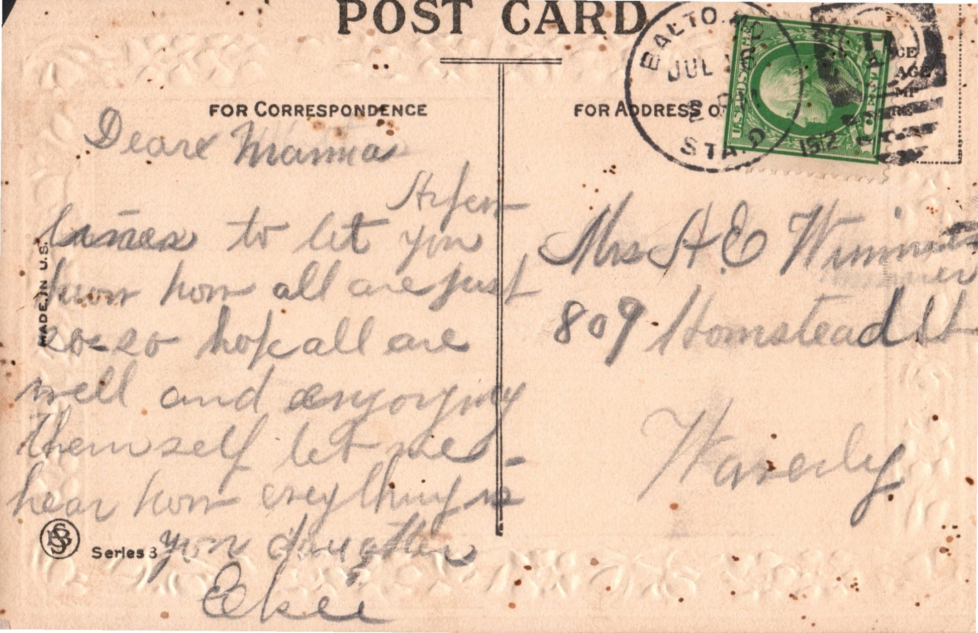 Union Sta. Transfer Clerk 1918 cds on damaged post card