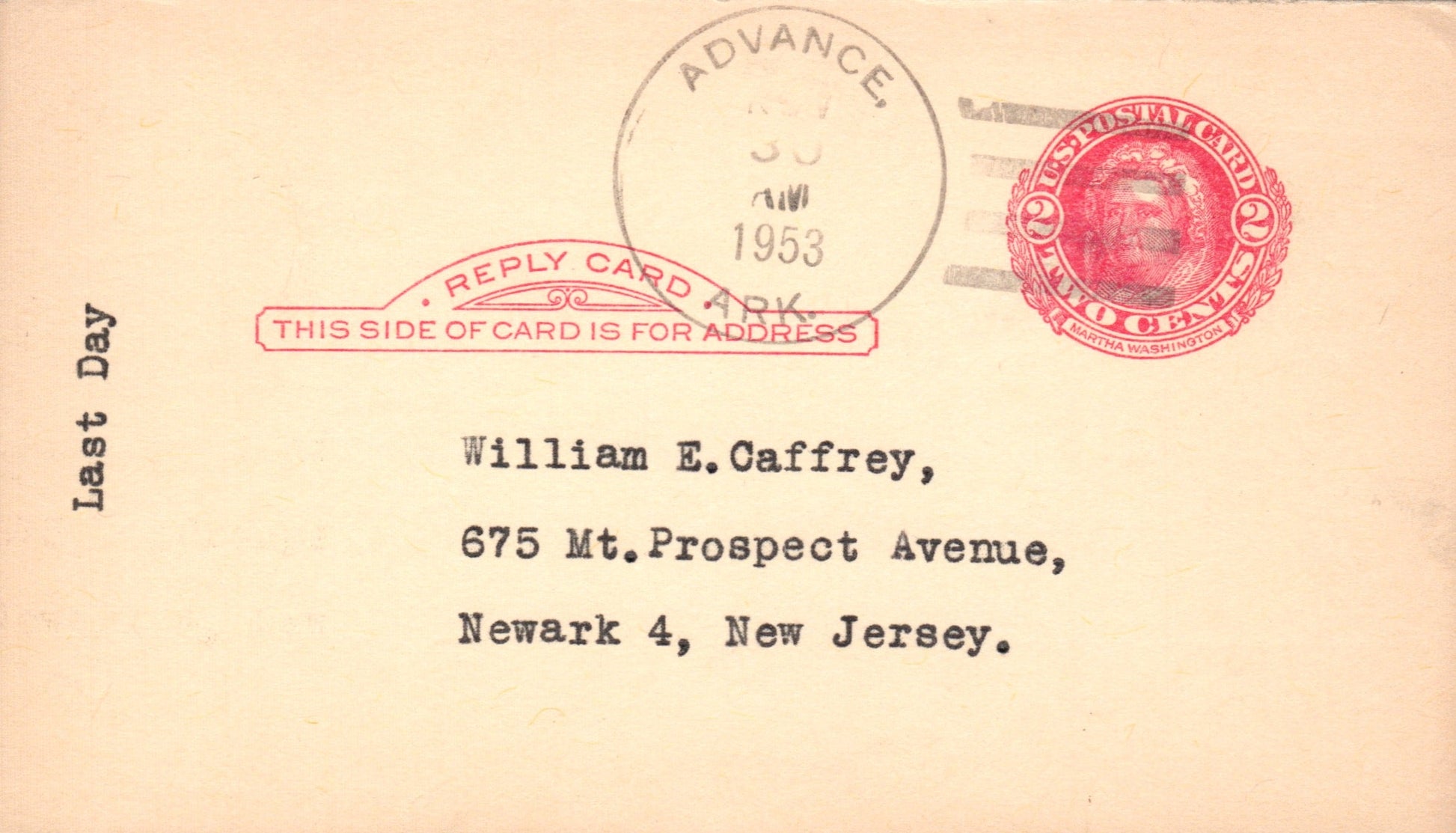 Advance (1905-1953) 1953 4-bar on LD Postal Card