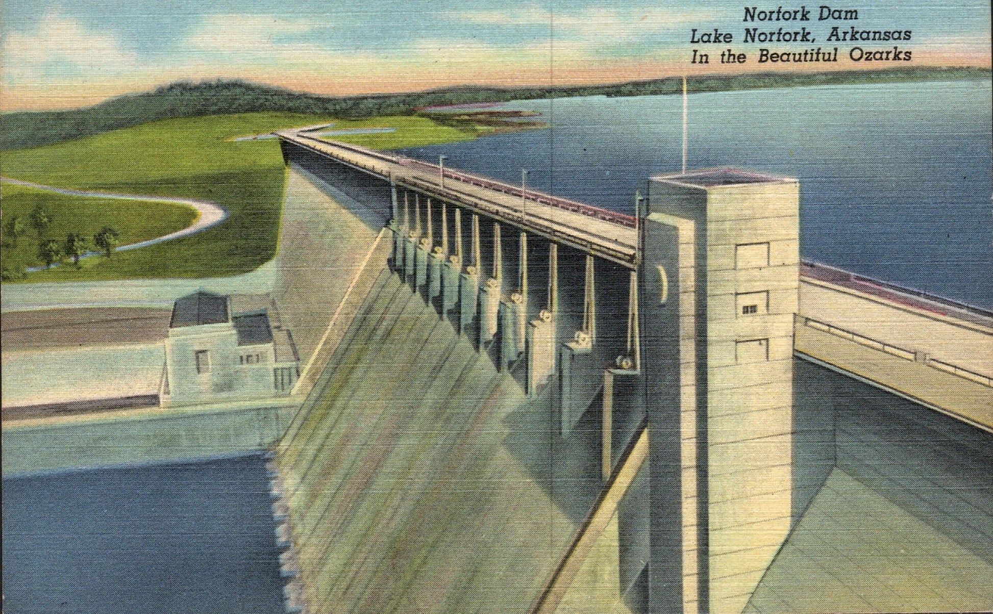 Norfork Post cards: Norfork Dam [2 linen views]; Tracy’s Landing [B&W]