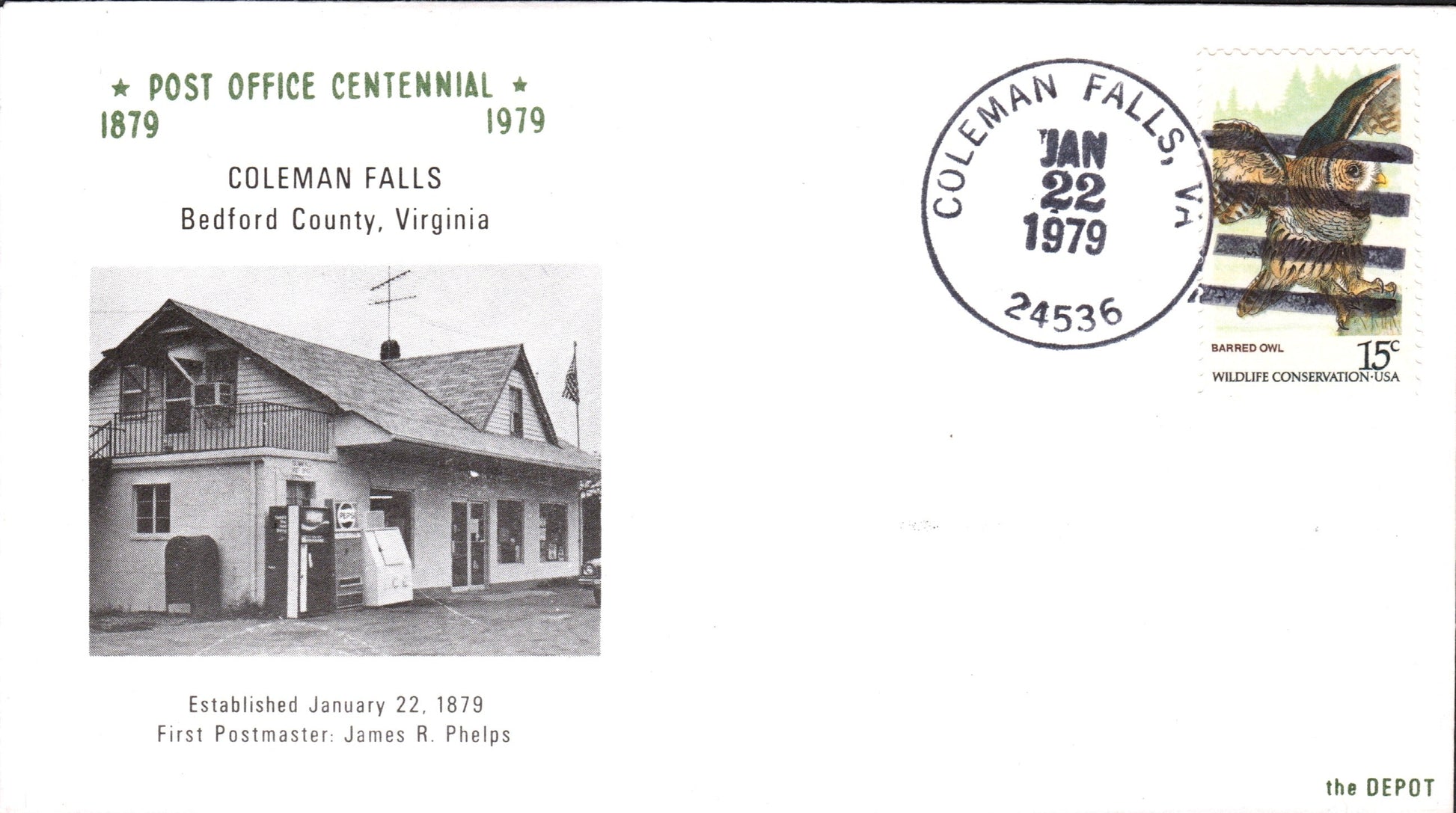 Coleman Falls 1966 4-bar on FD [of postal status] cover; 1979 4-bar on cacheted Centennial (of P.O.) cover