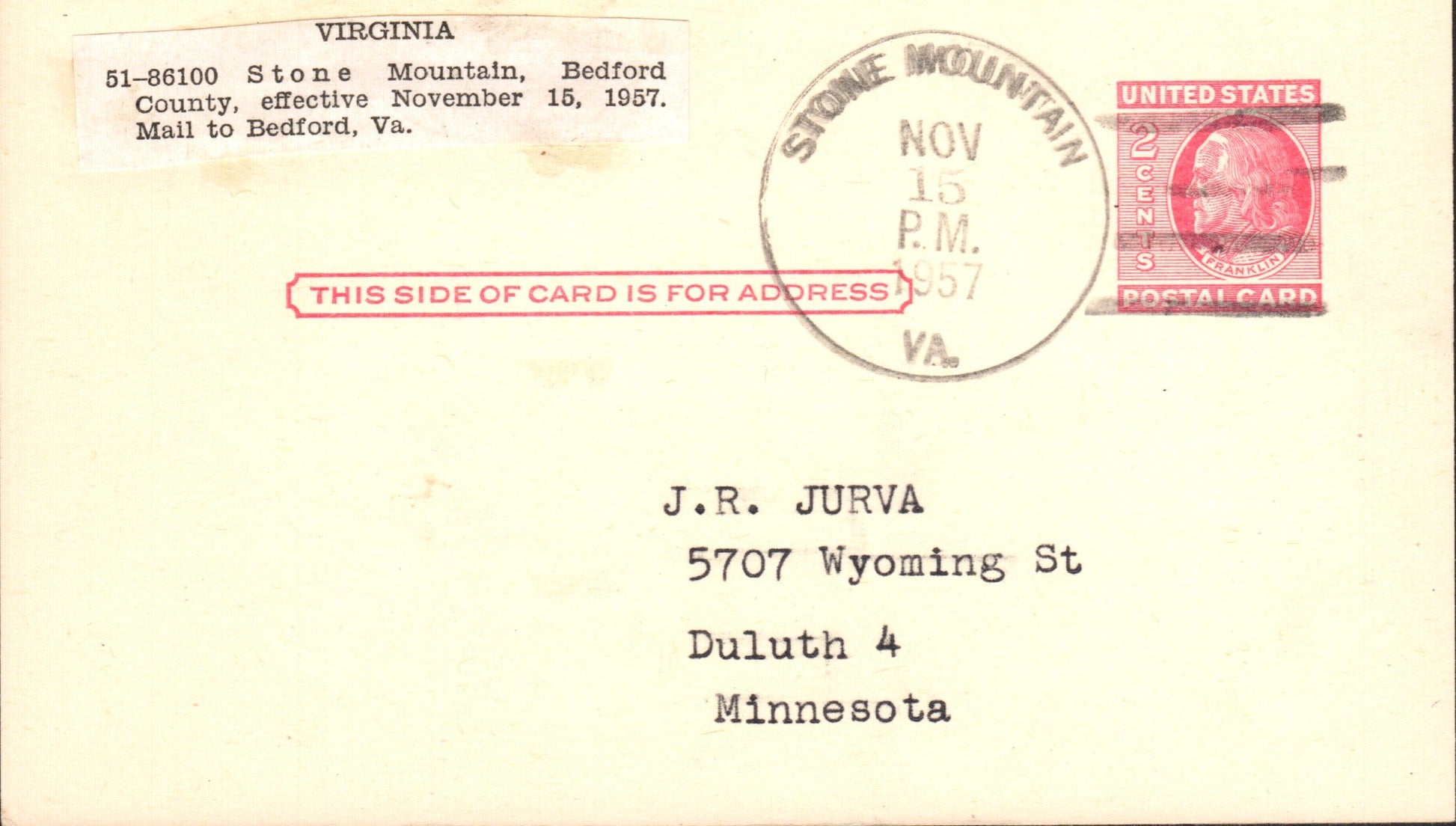 Stone Mountain (1909-1957) 1914 4-bar on post card; 1957 4-bar on LD Postal Card