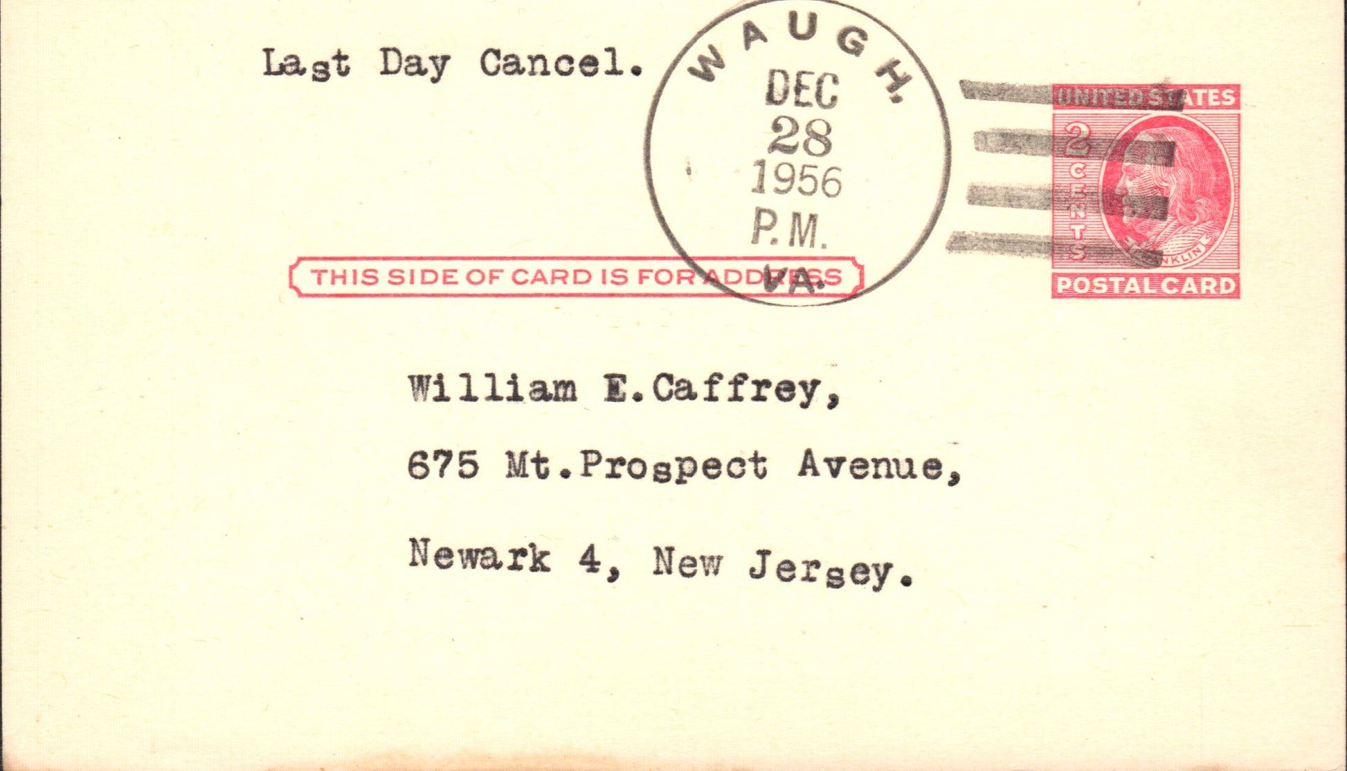 Waugh (1894-1956) 1956 4-bar on LD Postal Card