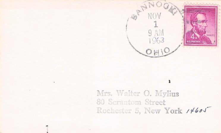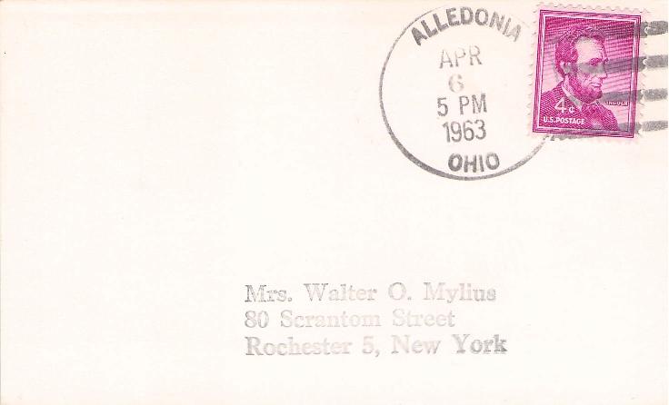 Alledonia 1963 4-bar on 3x5 card, PM autograph on back