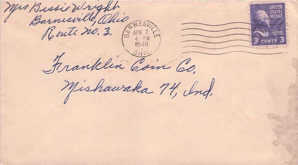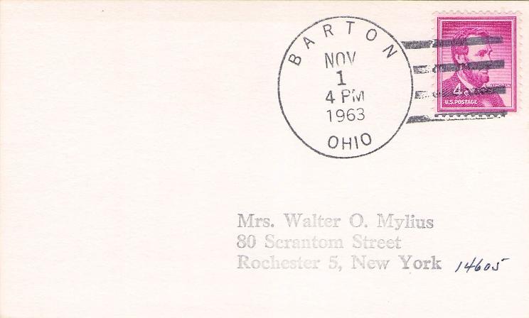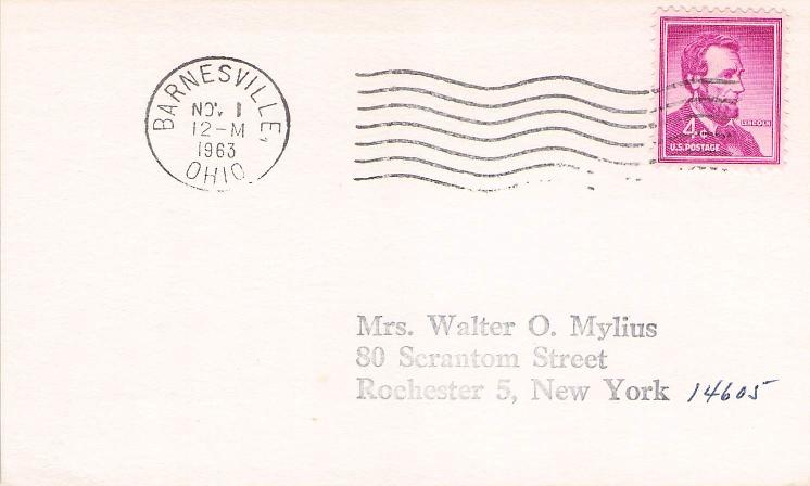 Barnesville 1890 cds on cover; 1905 duplex on cover, corner stain, letter enclosed; 1949 machine cancel on cover; 1963 machine cancel on 3x5 card.