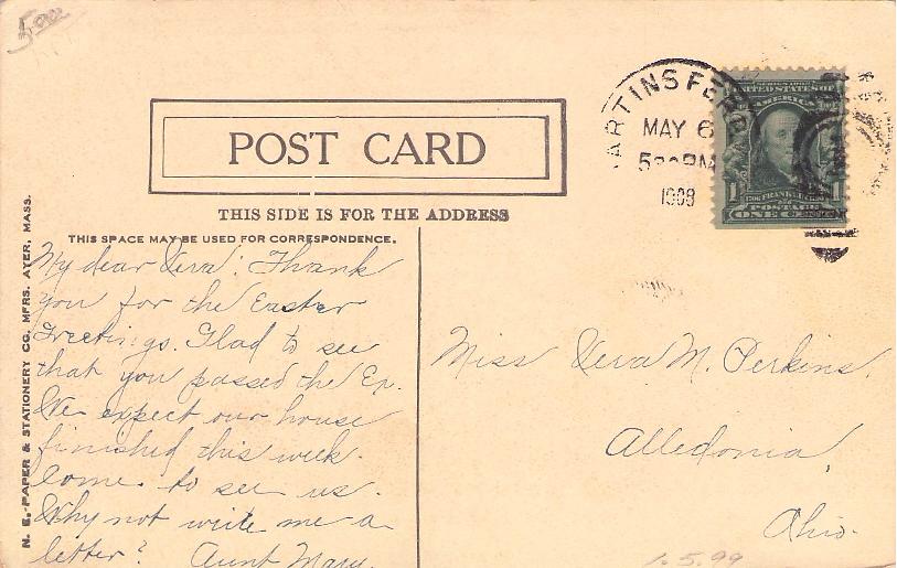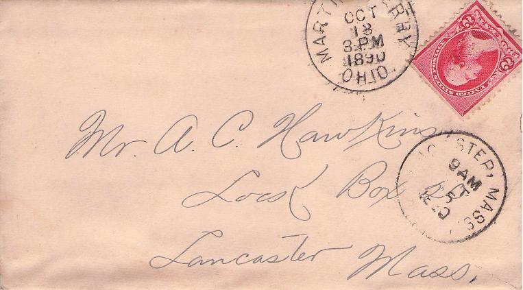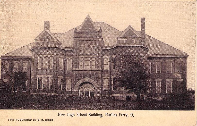 Martins Ferry 1890 cds [“--ins F--” off top] of small cover, with contents, part Lancaster Mass. rec’d mark; 1909 duplex on post card, view “New High School Building.”