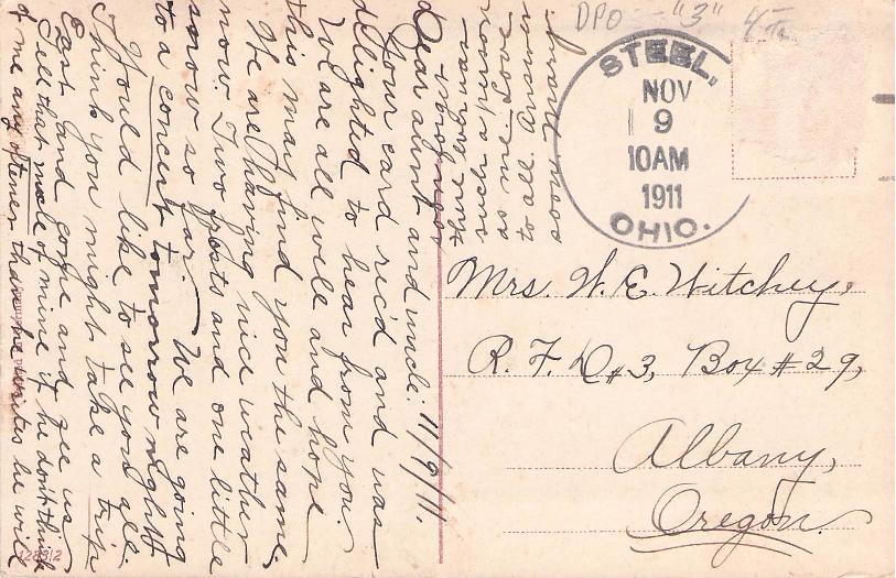 Steel (1885-1918) strong 1911 4-bar on post card, sadly with stamp removed
