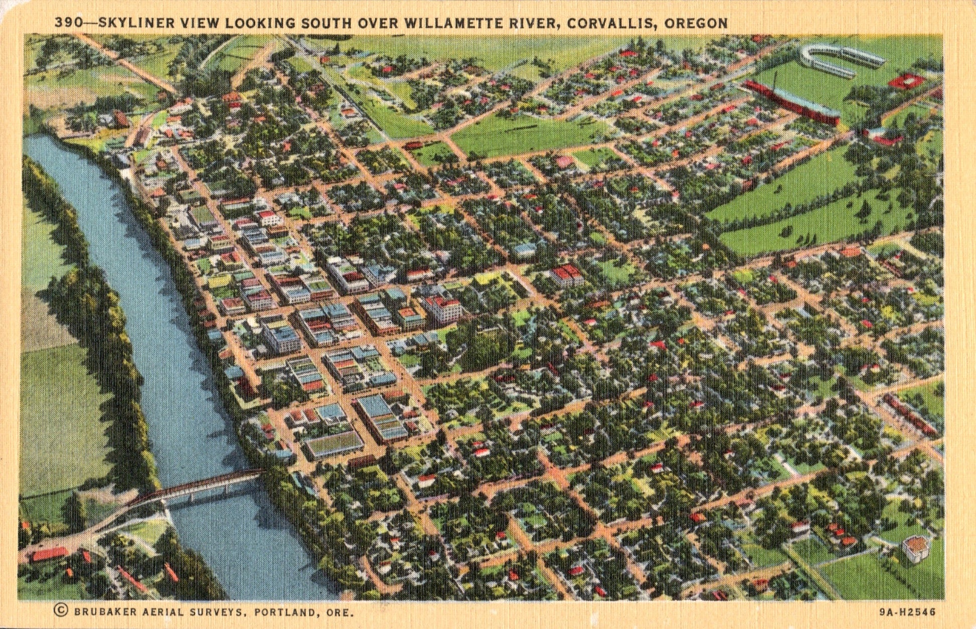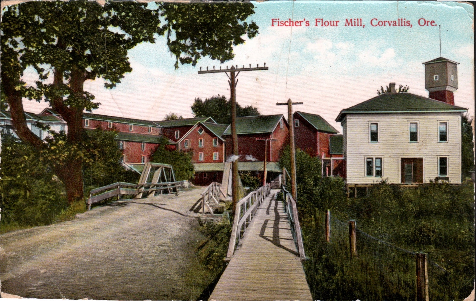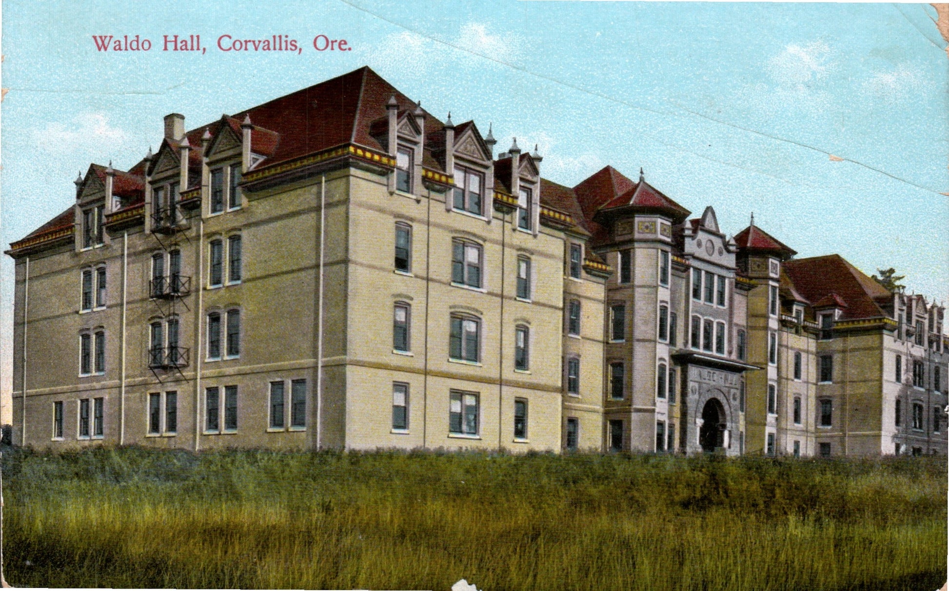 Post card: Two Aerial views [one linen, one Continental-size]; Fisher’s flour mill [1909]; OSU Administration building [1920, creased]; OSU Waldo Hall [1916, edge damage]