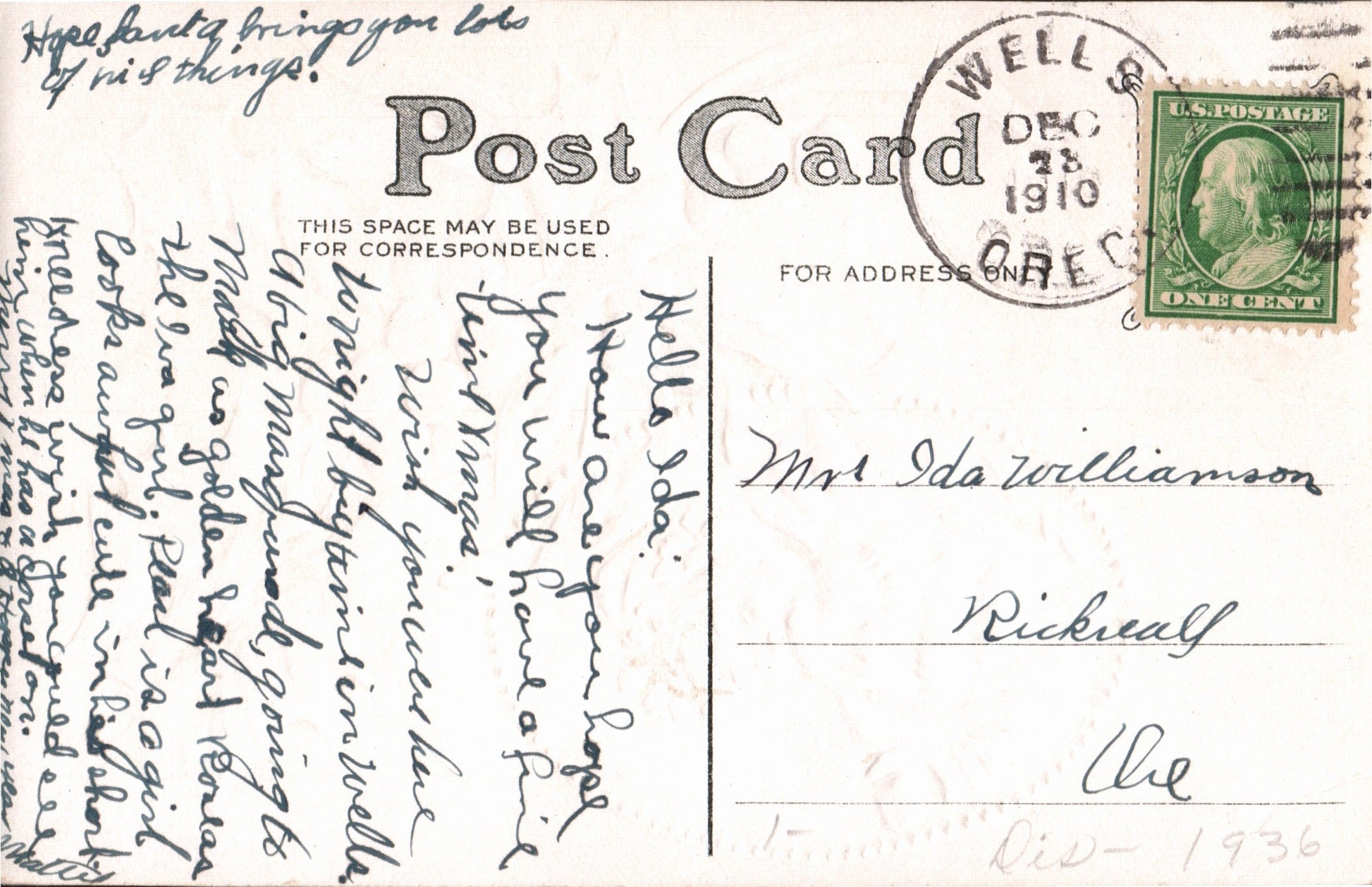 Wells (1880-1936) 1910 duplex on post card