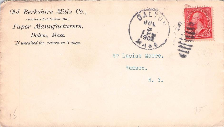 - Dalton 1902duplex on cover, “Old Berkshire Mills Co., Paper Manufacturers” corner