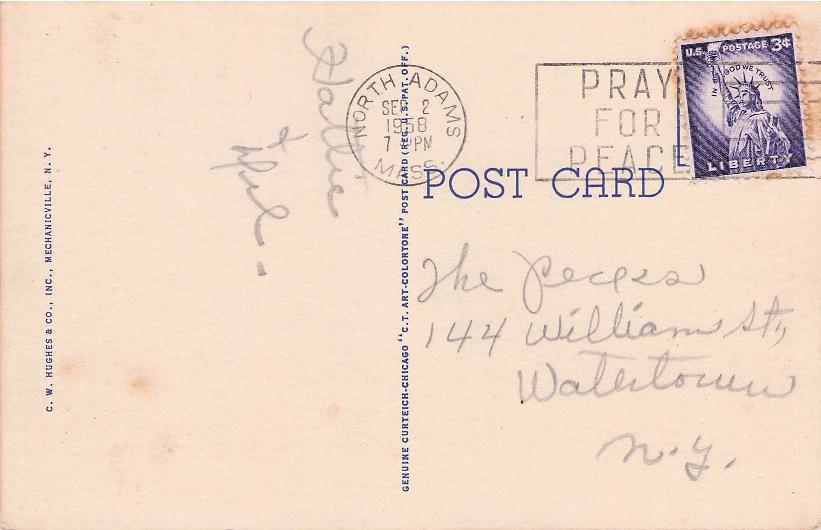- North Adams 1958 machine slogan “Pray for Peace” on post card.