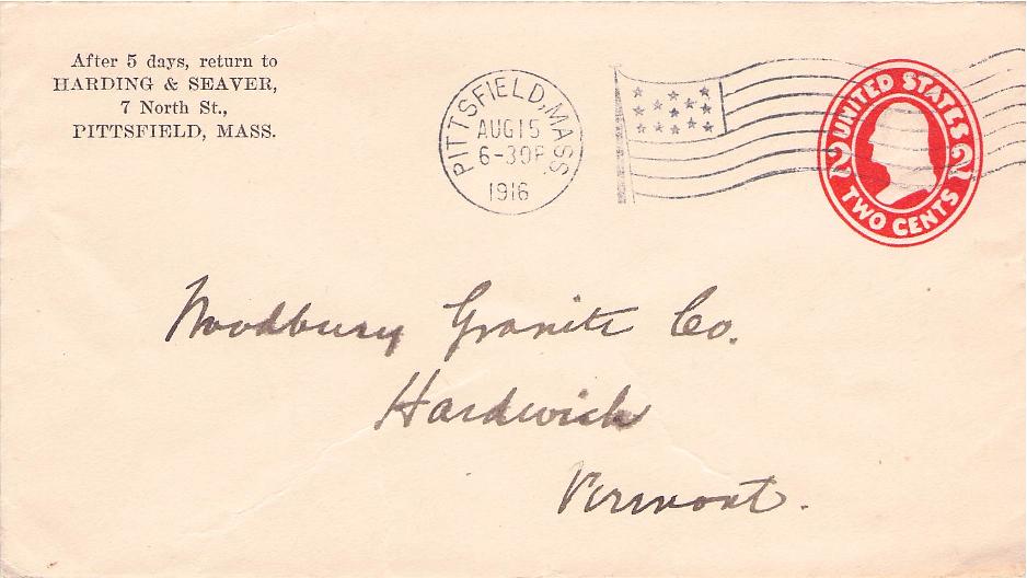 - Pittsfield 1850s cds with “PAID] in dial partially off cover;.1916 Flag cancel on cover, “Harding & Weaver” corner