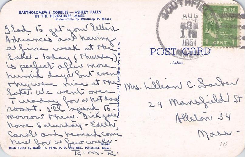 - Post cards: “Eaton Hurlburt Paper Co. [1907 Boston & Albany RPO]; “House of Mercy” [1908, missing corner]; Balance Rock [3 views, one c.1930, two chrome]