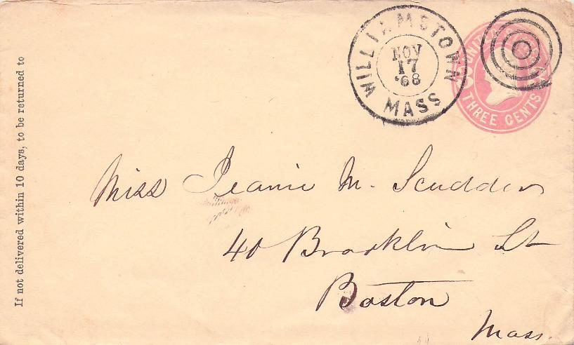 - Williamstown 1868 double circle cds and target killer on cover; 1921 Flag cancel on post card; 1992 machine cancel on cover.