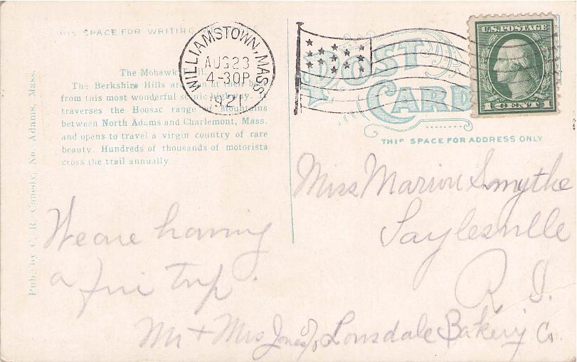 - Post cards: “Hoosac Tunnel is 1060 feet below” [c.1930]; “Mount Greylock, Highest Mountain in Mass” [1916]; “State Line Tunnel” with train [c.1930]; Route 2 [2 chrome views, one damaged]; “Looking towards Lanesboro” [1961]; “Green Water Pond and Highway” [linen]; Cold River Canyon [1931]; “Mohawk Trail” [c.1920]; “Greetings from The Berkshires” [2 road views, linen]; Whitcomb Summit [c.1930]