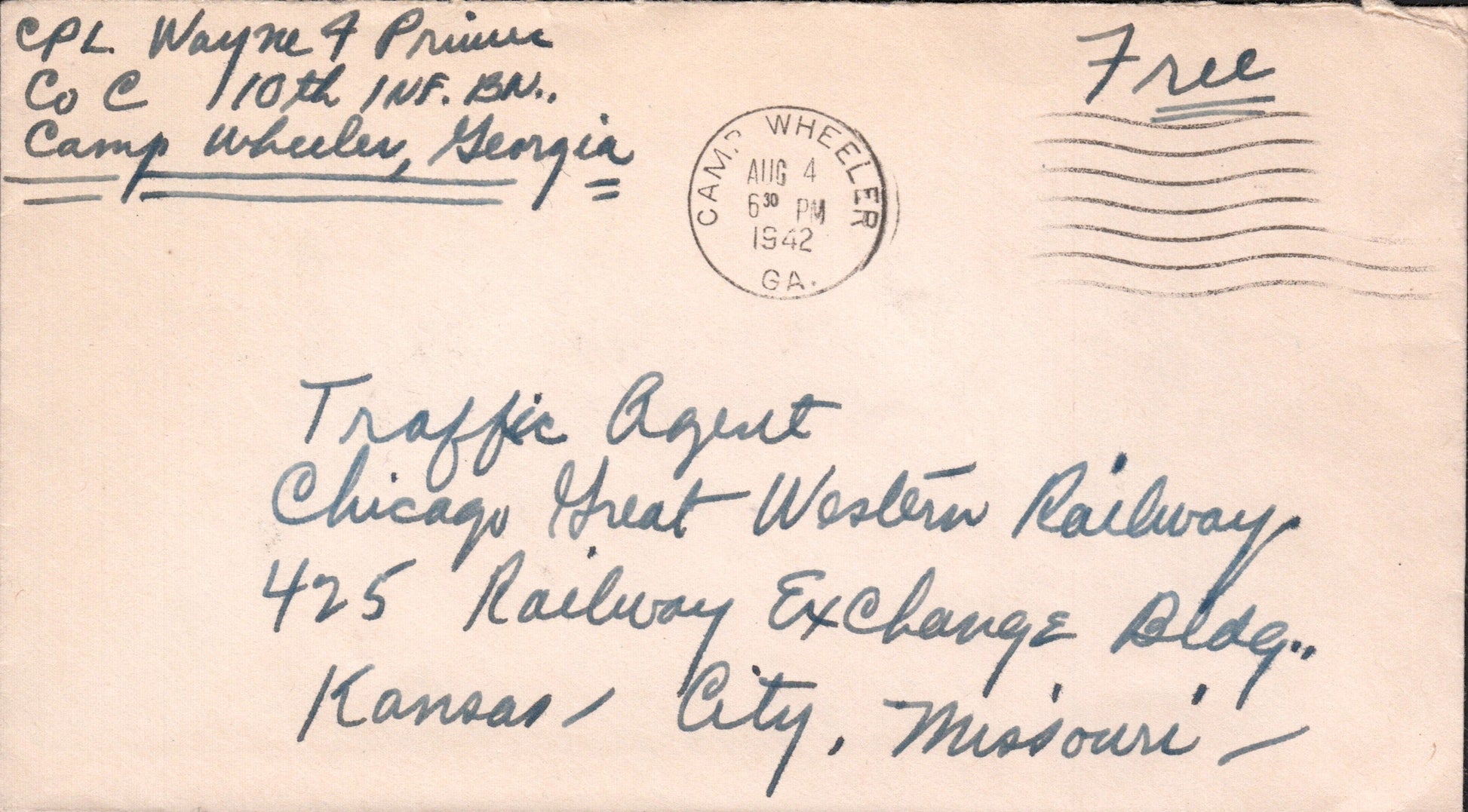 Camp Wheeler 1942 machine cancel on cover, Soldiers’ Free Mail