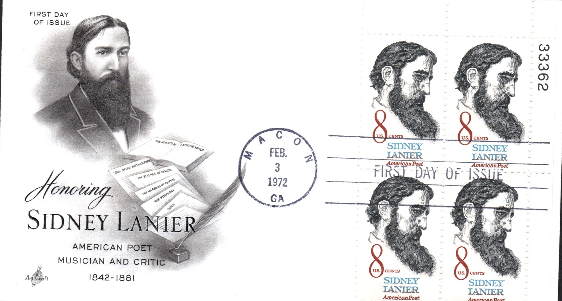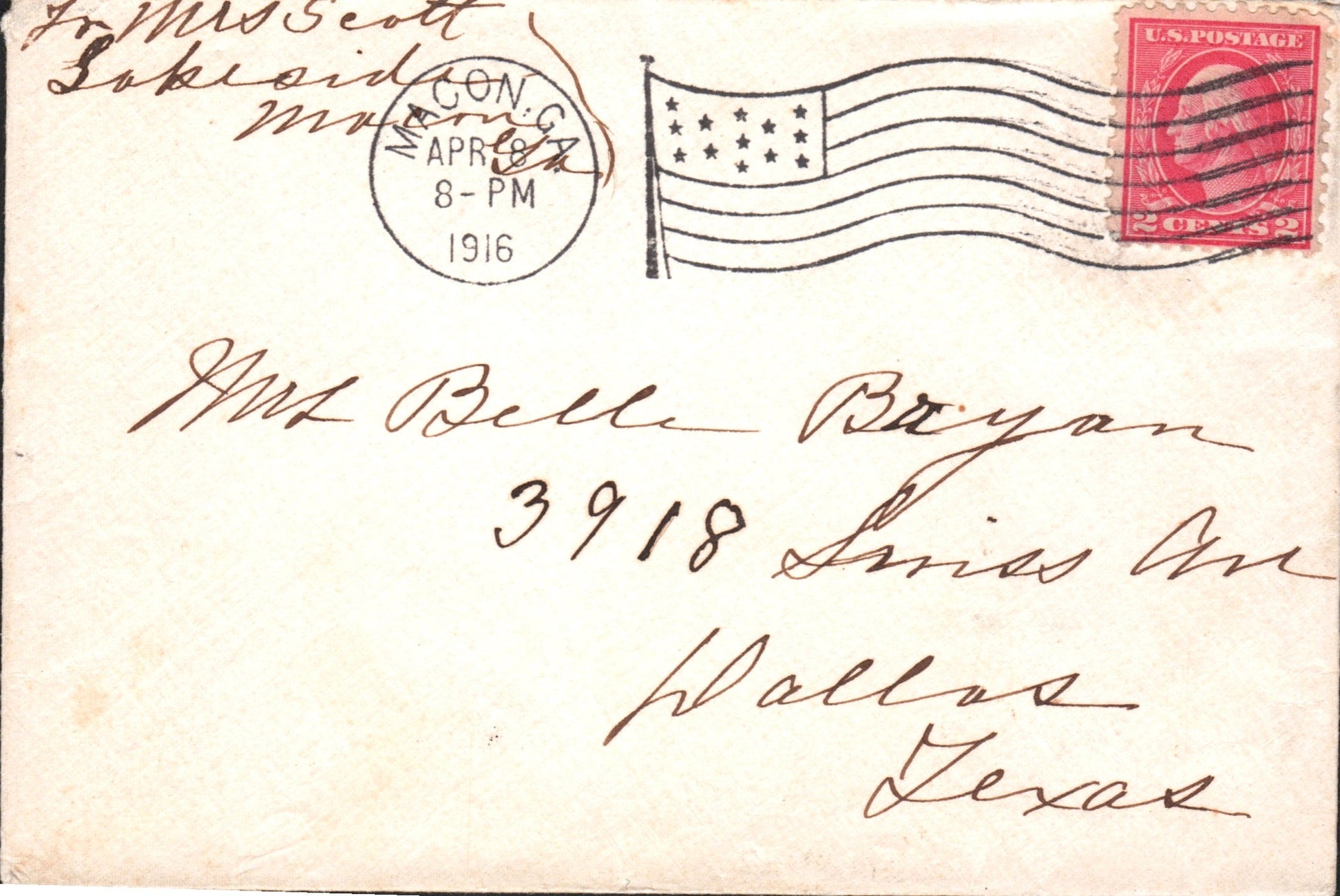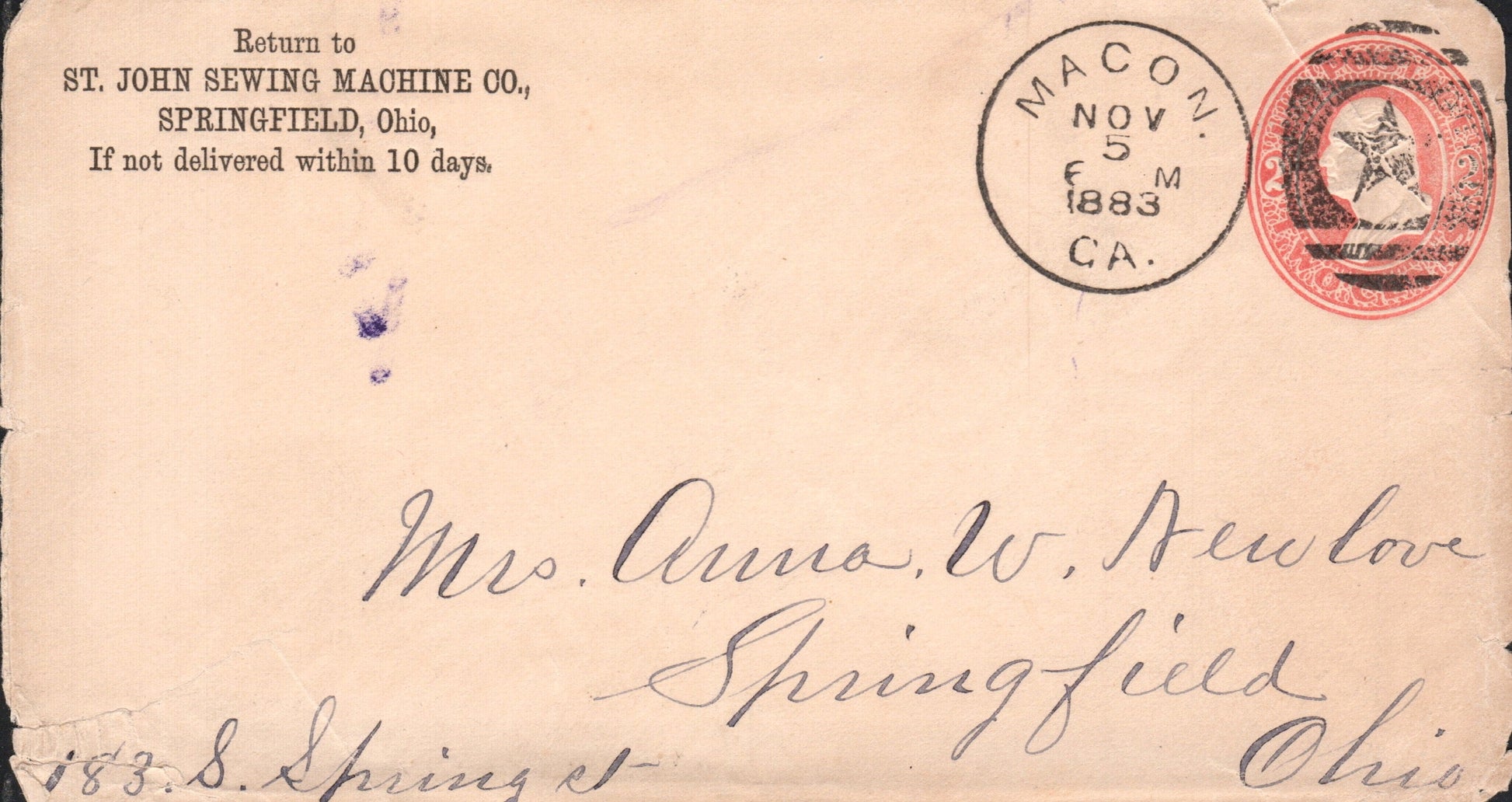 Macon 1883 duplex on cover, “St. John Sewing Machine Co.” corner, edge wear; 1916 Flag cancel on cover; 1965 machine slogan for Heart Fund on 3x5 card; 1972 machine First day of issue Sidney Lanier stamp