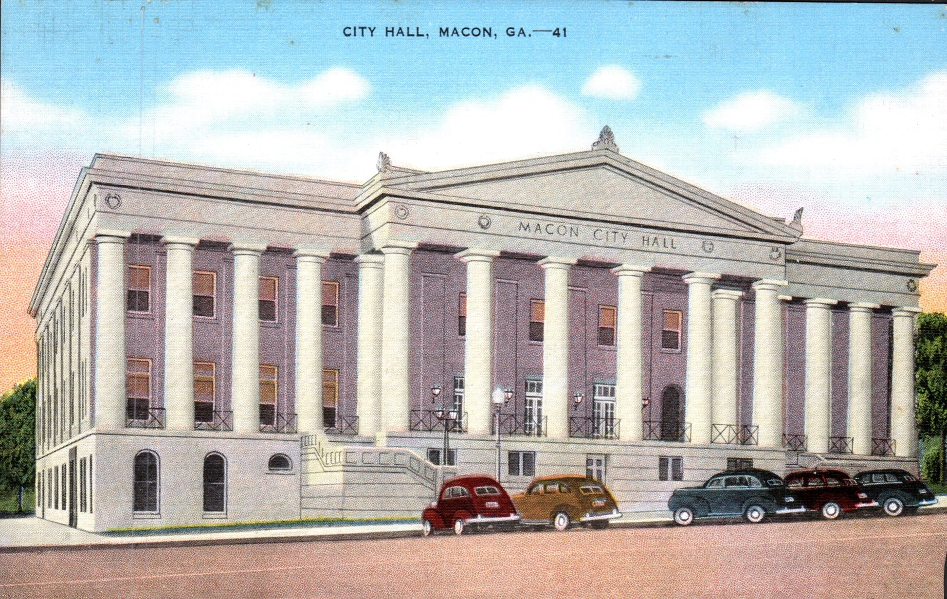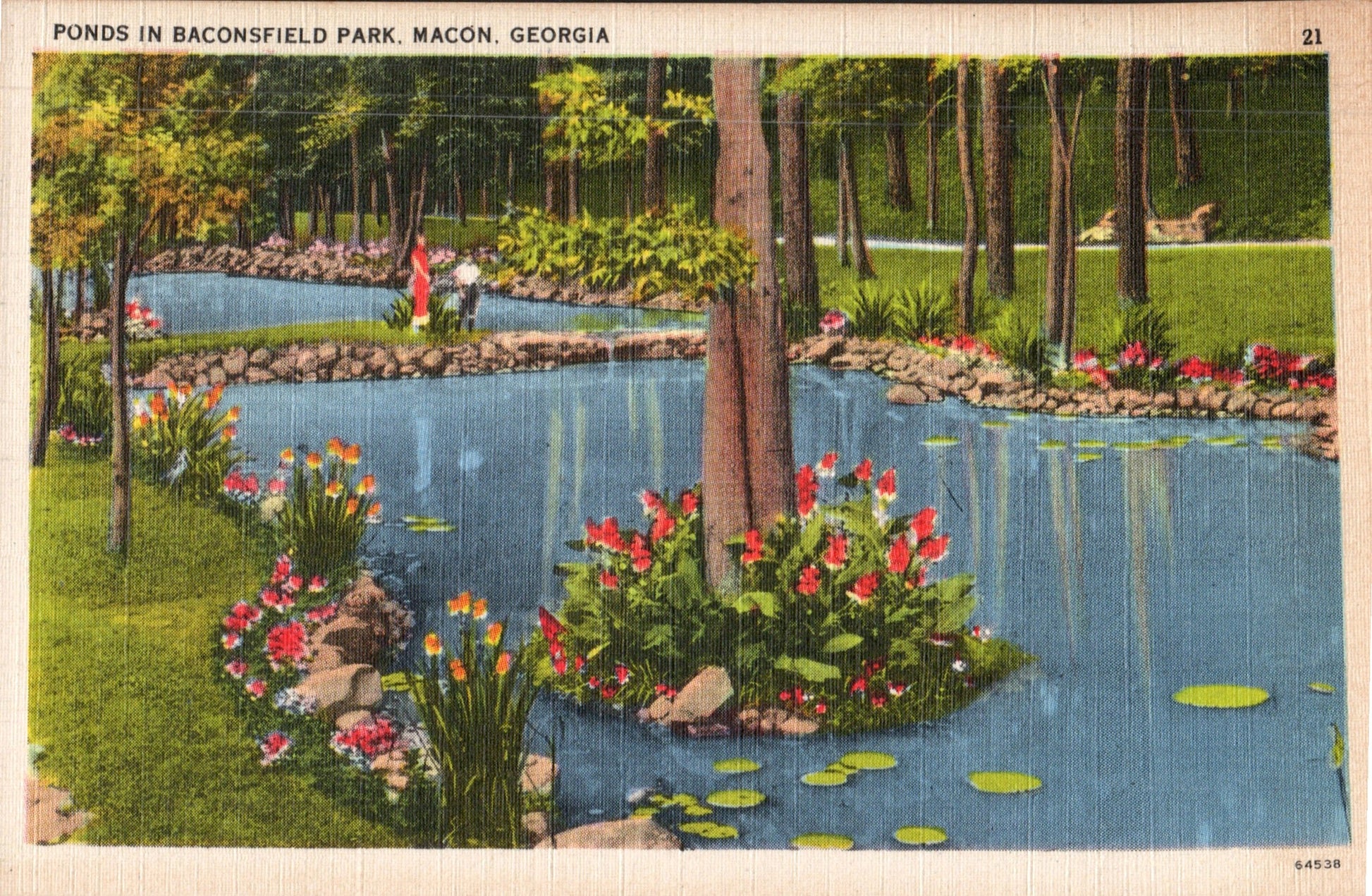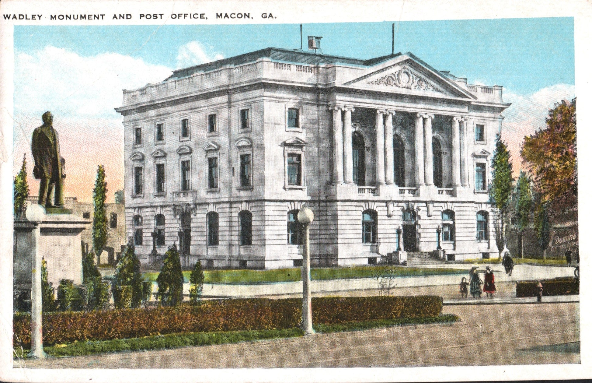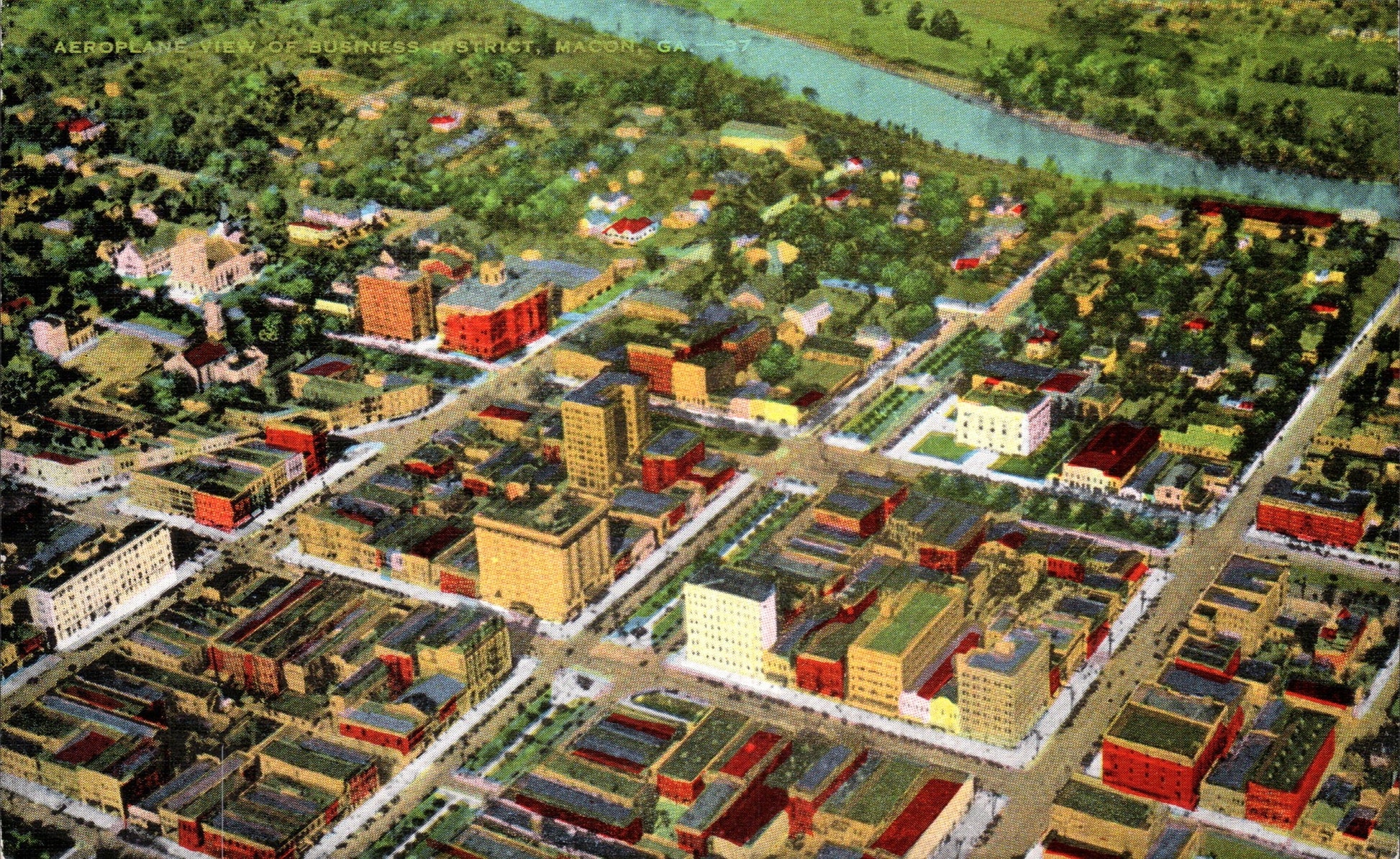 Post cards: Downtown, aerial view [linen]; Third Street Park and downtown buildings [linen, 1945]; Exchange Bank [c.1910]; Bankers Insurance bldg. [linen]; “New Hotel Dempsey” [c.1910]; Ambassador Motel, aerial view [chrome]; Motel Alpine swimming pool [chrome]; Drill’s Court [linen]; Magnolia Court [2 chrome views]; Post Office [1920s?]; Court house [linen]; City Hall [linen]; Mercer Univ. Administration bldg. [chrome]; Greater Wesleyan College [linen, scuff marks]; St. Paul’s Church [c.1910]; Hay House [chrome]; “Old Cannon Ball House” [chrome]; Wesleyan Conservatory [linen]; Washington Park [linen]; “View at Coleman Hill” [linen]; Baconsfield Park [linen]; “Ponds in Baconsfield Park” [linen]