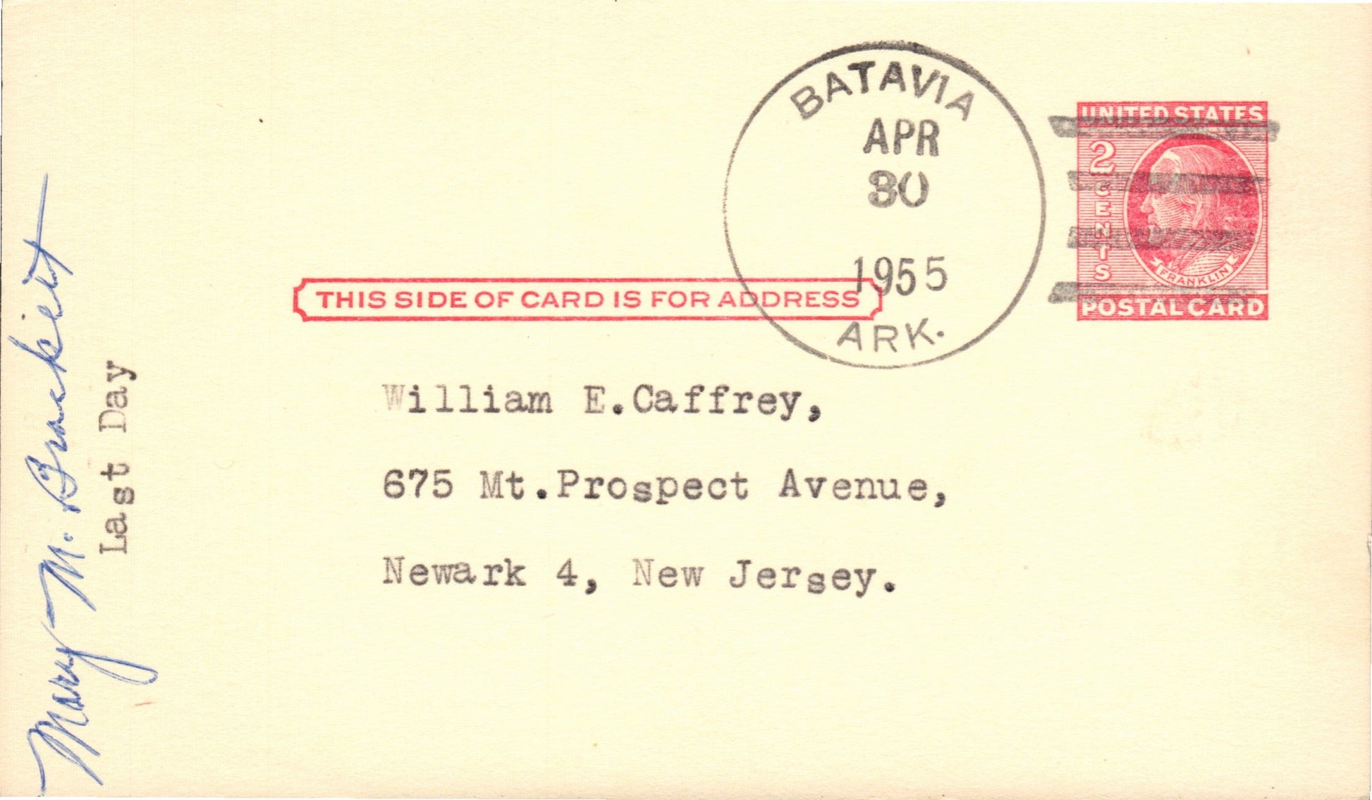 Batavia (1883-1955) 1955 4-bar on LD Postal Card
