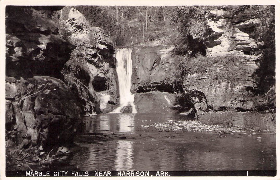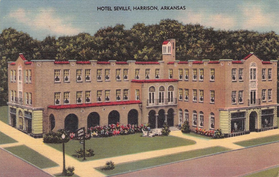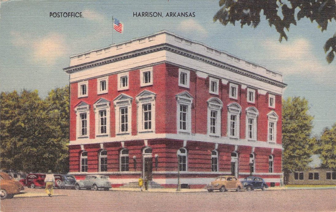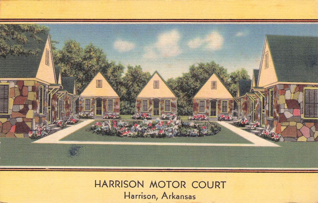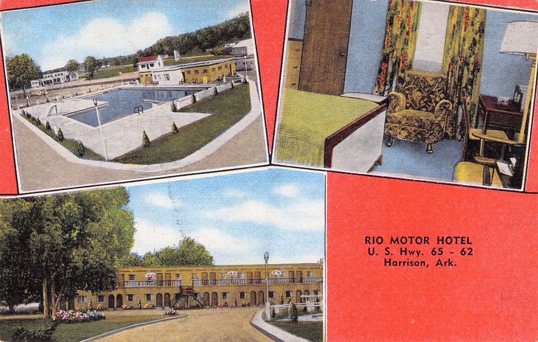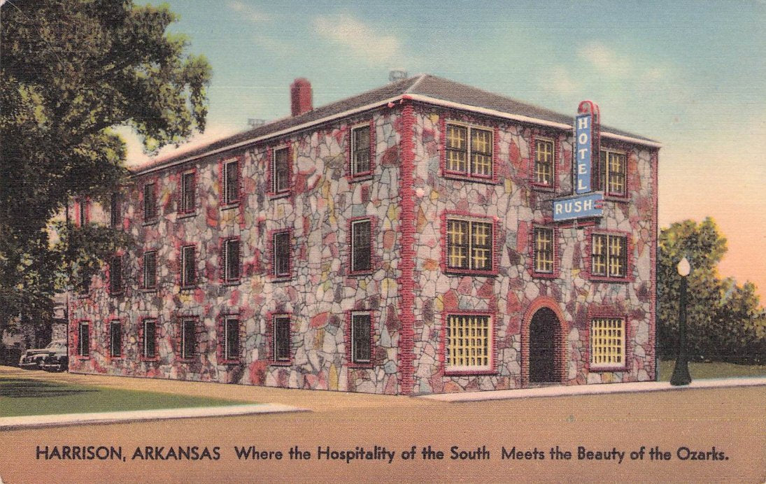 Harrison Post cards: Main Street [linen, 1930s]; Harrison Motor Court [linen]; Hotel Rush [linen]; Rio Motor Hotel [2 views, one linen, one chrome]; Hotel Seville [2 views,one B&W c.1940, one linen]; Siesta Motel [linen]; New Valley Inn Motel [chrome]; Post office [linen]; Court House & Mountain Meadows Massacre monument [chrome]; Buffalo River [3 linen views]; Marble City Falls [B&W[