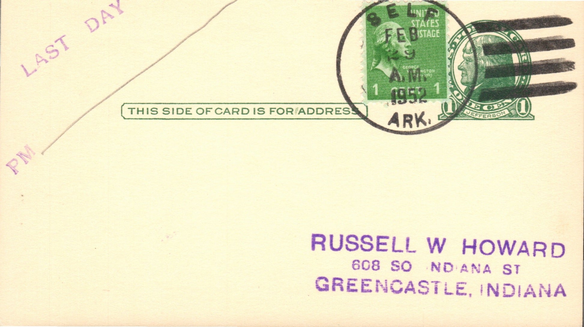Self (1893-1952) 1952 4-bar on LD Postal Card