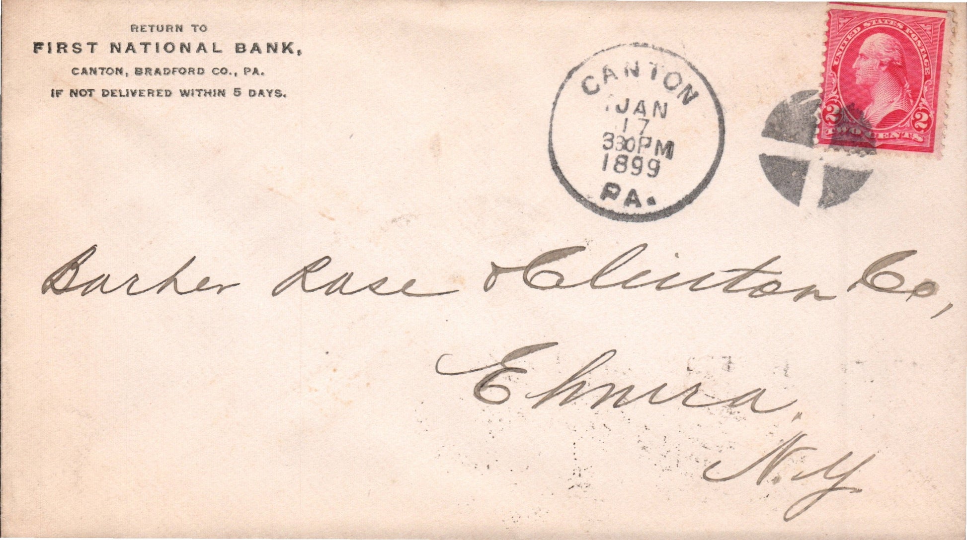 Canton 1889 cds on cover; 1899 cds & cork killer on cover w/ “First National Bank, Canton” corner