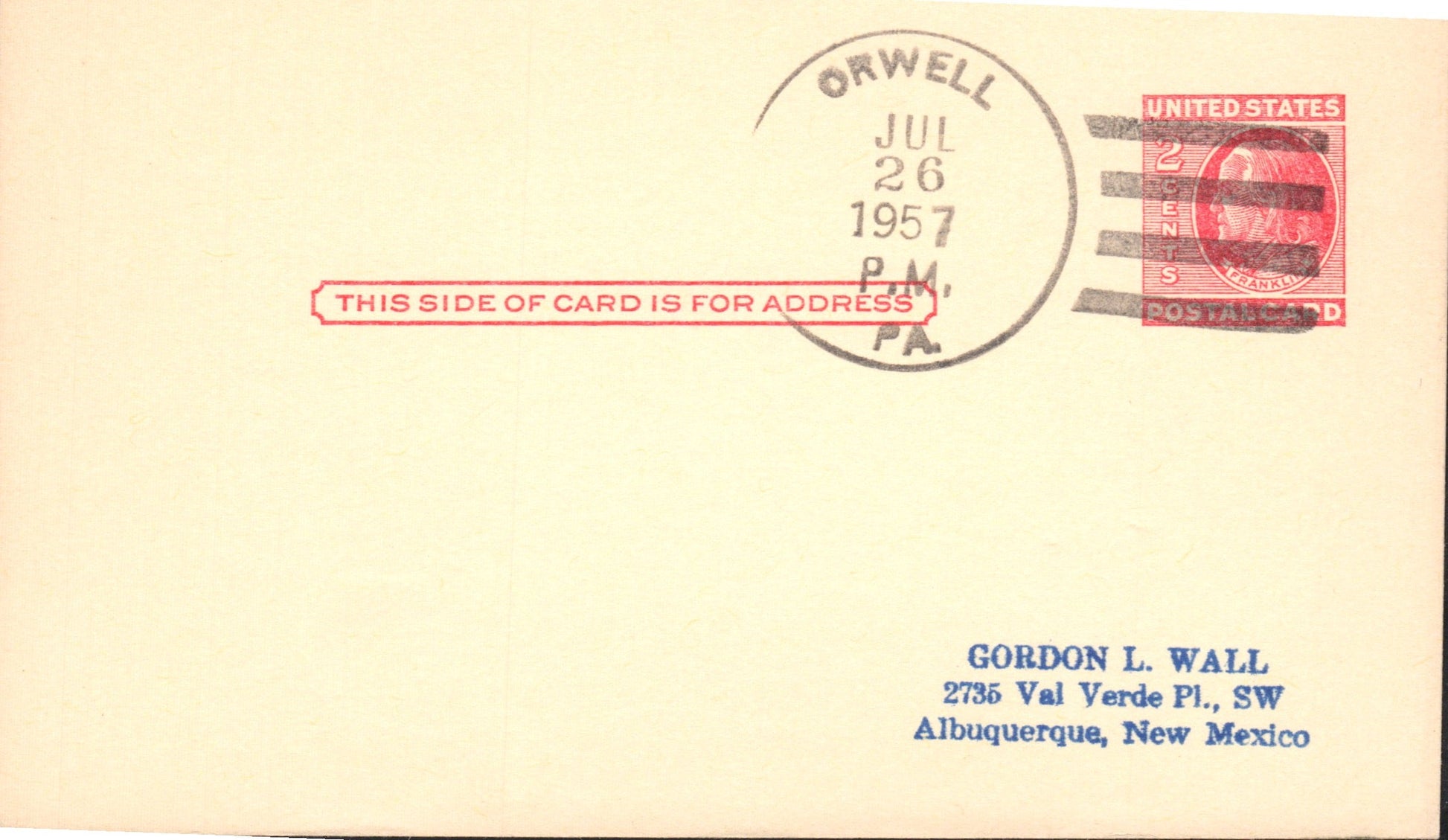 Orwell (1815-1957) 1957 4-bar on Postal Card