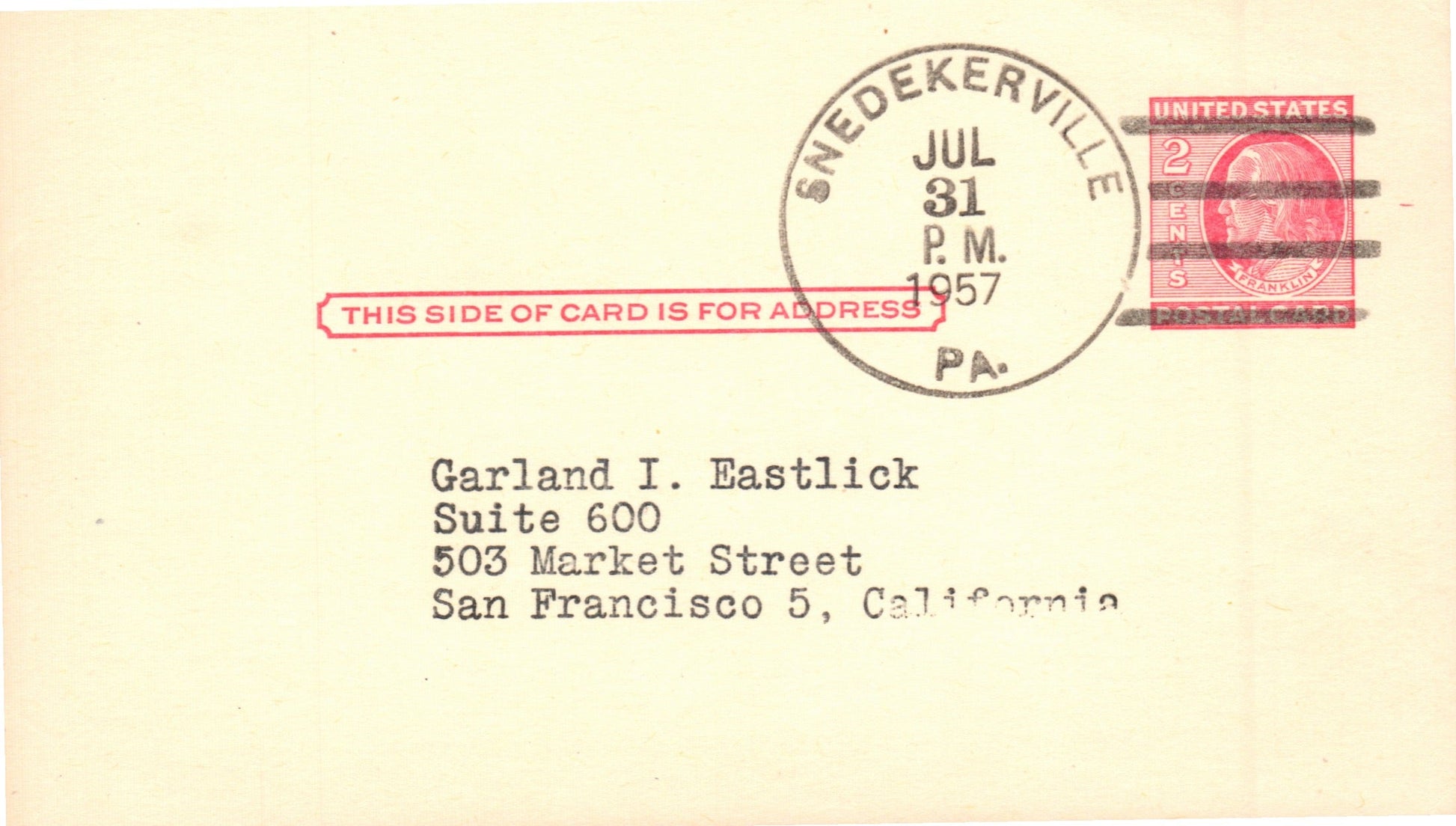 Snedekerville (1897-1963) 1957 4-bar on Postal Card
