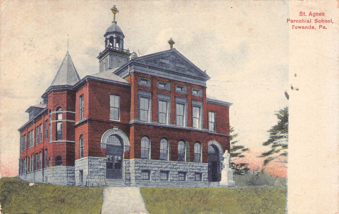 Troy 1907 duplex on post card, view of Troy High School (B&W).