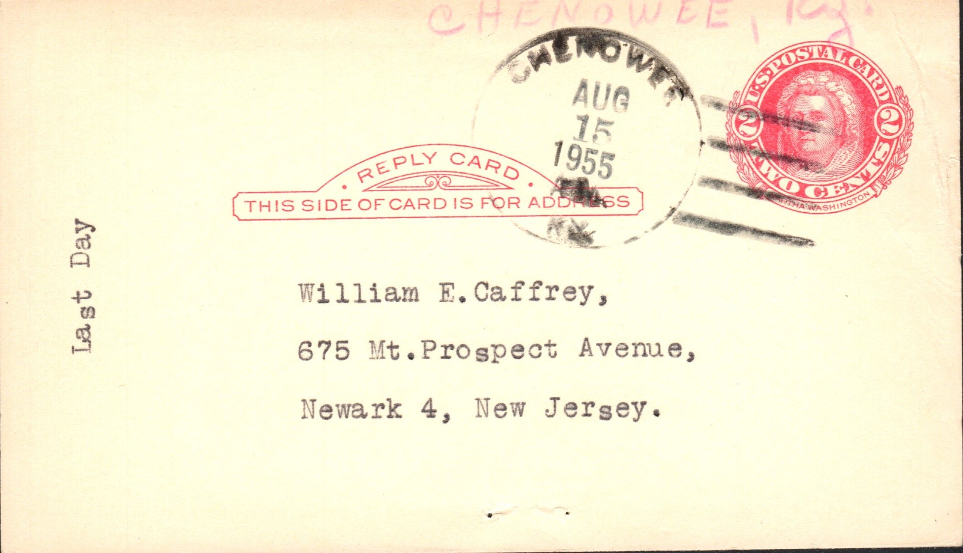 Chenowee (1917/55) 1955 4-bar on LD Postal Card
