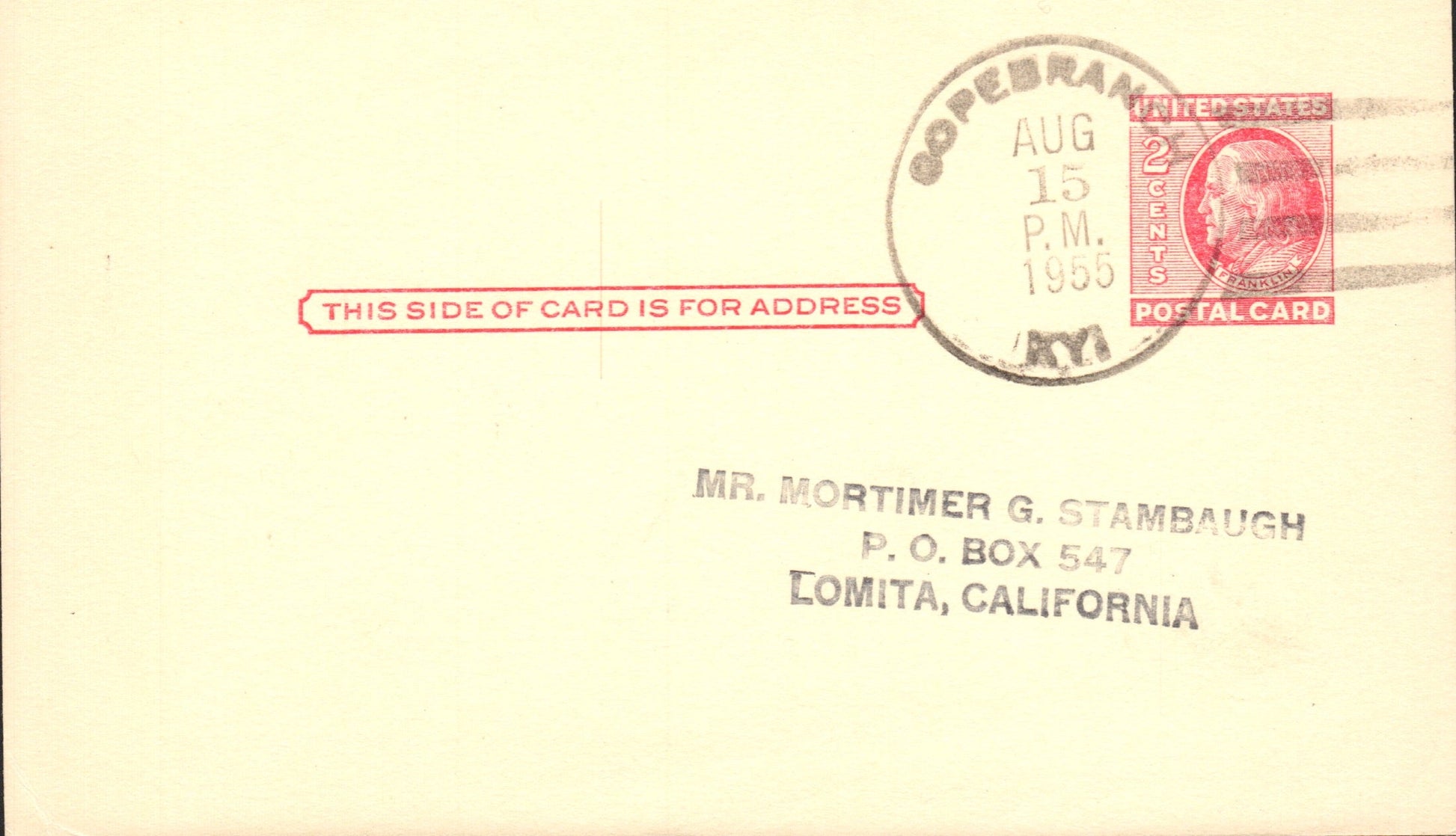 Copebranch (1886-1955) 1955 4-bar on LD Postal Card