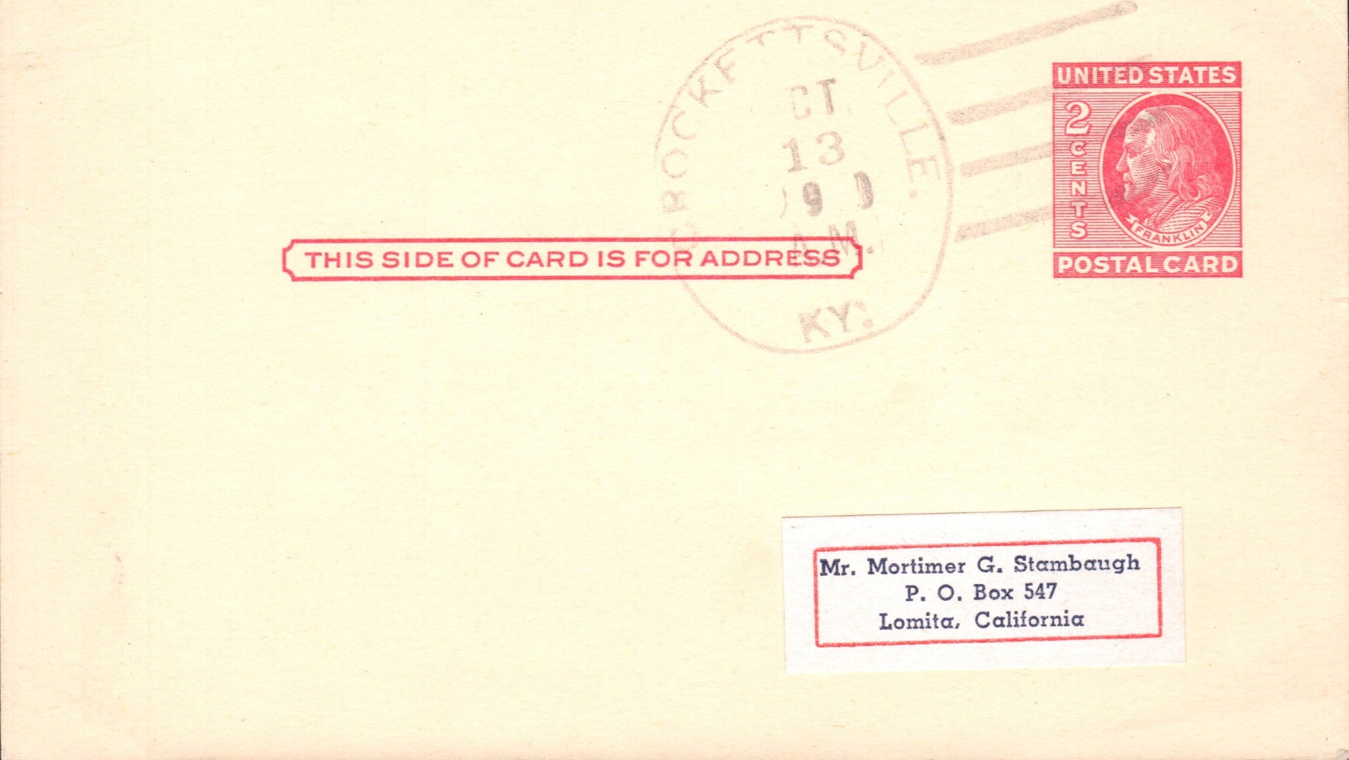 Crockettsville (1849-1955) poor 1955 4-bar on LD Postal Card