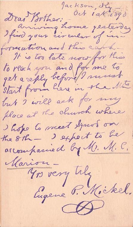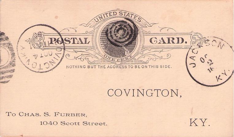 Jackson 1890 cds on Postal Card, Covington rec. mark