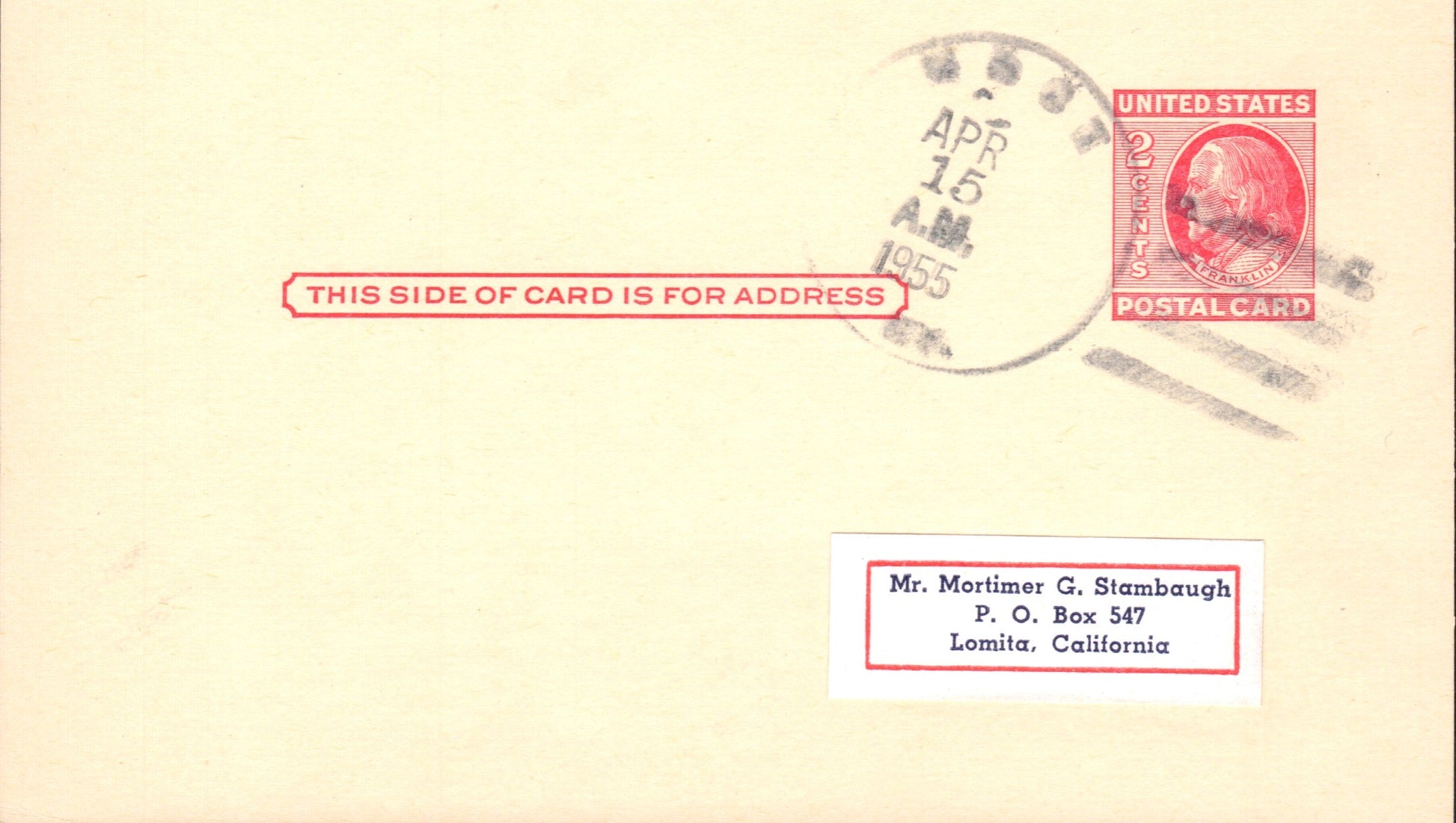 Moct (1922-55) 1955 4-bar on LD Postal Card