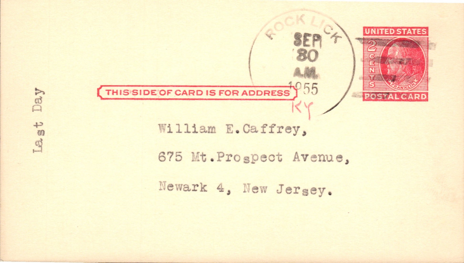 Rock Lick (1936-55) poor 1955 4-bar on Postal Card