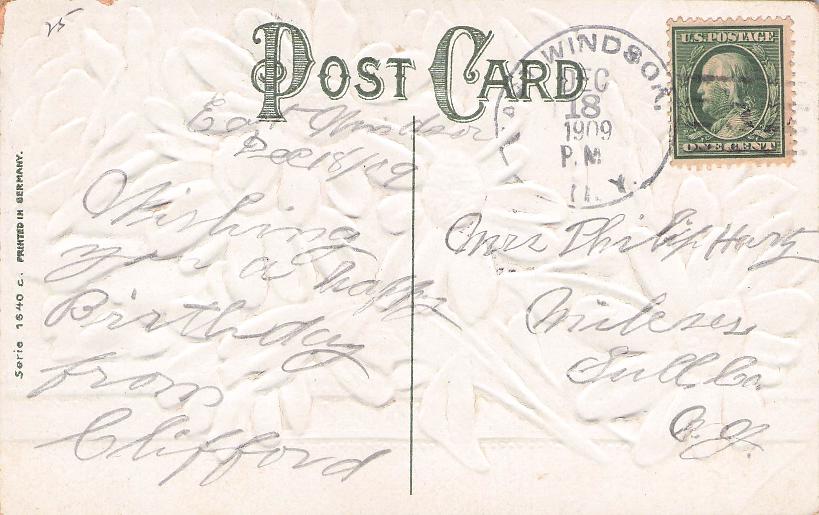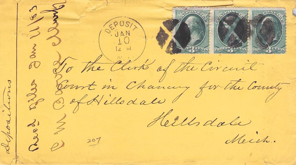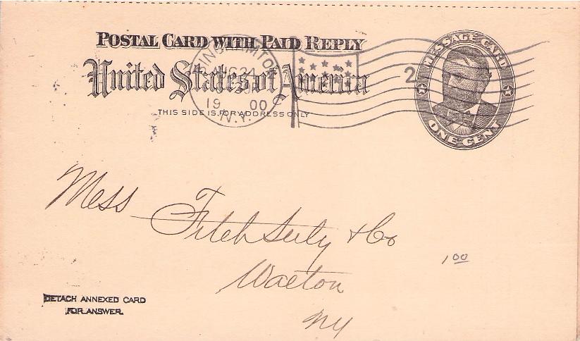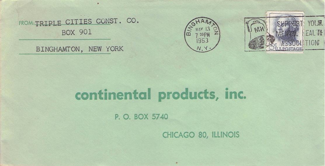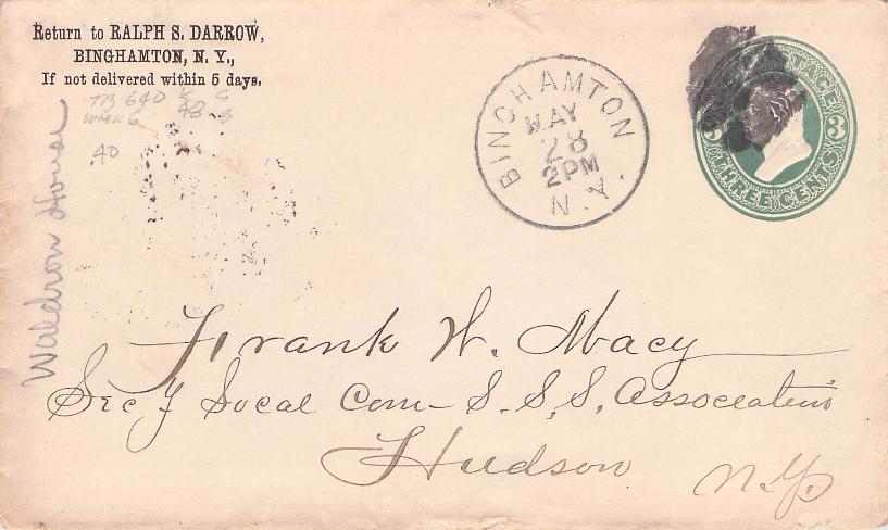 Binghamton 1883 cds on cover (U163 die 57); 1891 duplex on cover, Green Bay Wis. backstamp; 1900 Flag cancel on Postal card, Walton NY Rec’d backstamp; 1902 machine cancel on cover with “Wilkinson Manufacturing Co.” corner; 1919 machine cancel on cover; 1932 machine cancel on cover; 1963 Mental Health slogan on cover.