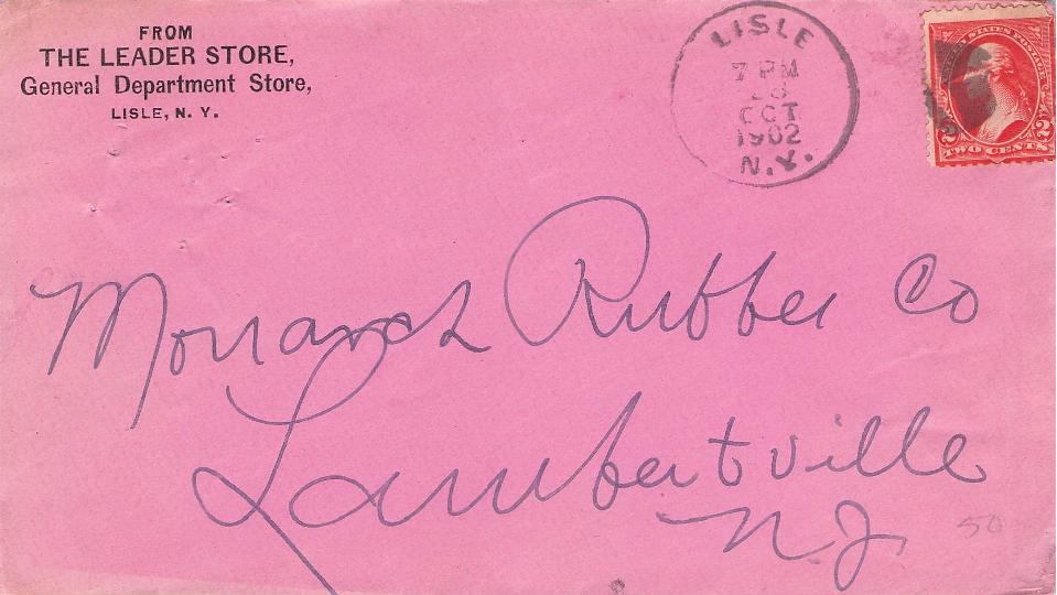 Lisle 1901 cds on pink cover, “The Leader Store” corner