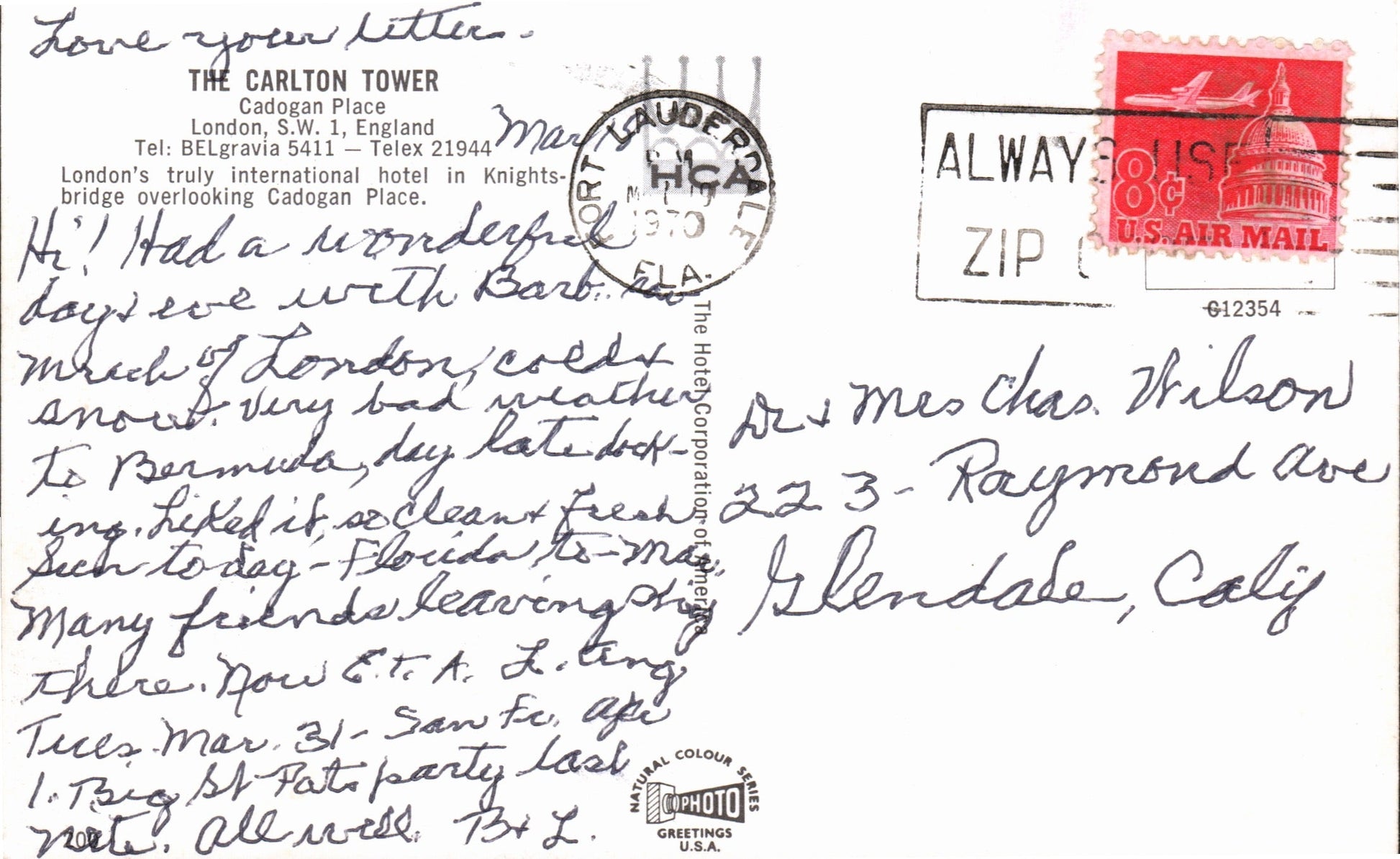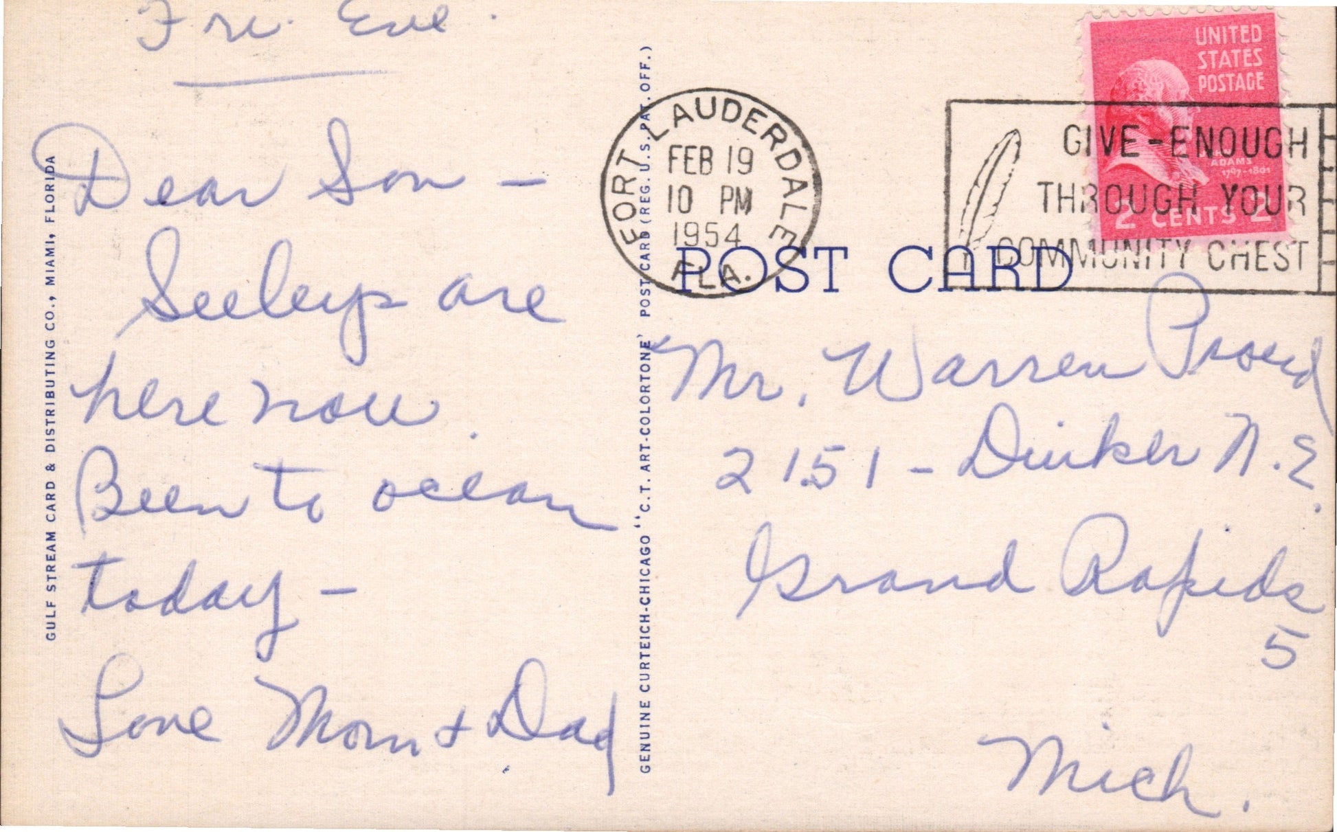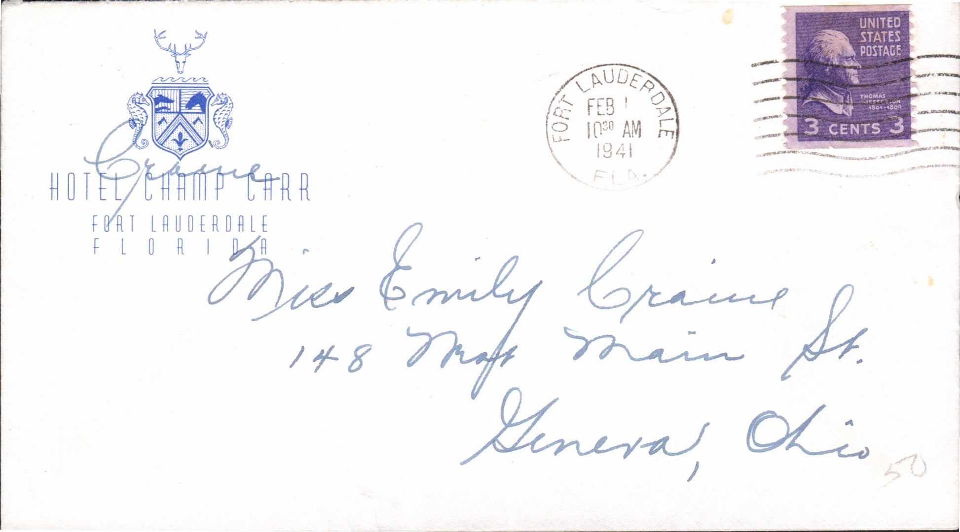 Fort Lauderdale 1941 machine cancel on cover, Hotel Champ Carr corner; 1954 machine Community Chest slogan on post card; 1970 machine slogan “Always Use Zip- Code” on post card; 1975 unusual 2-bar [machine or roller?] on cover