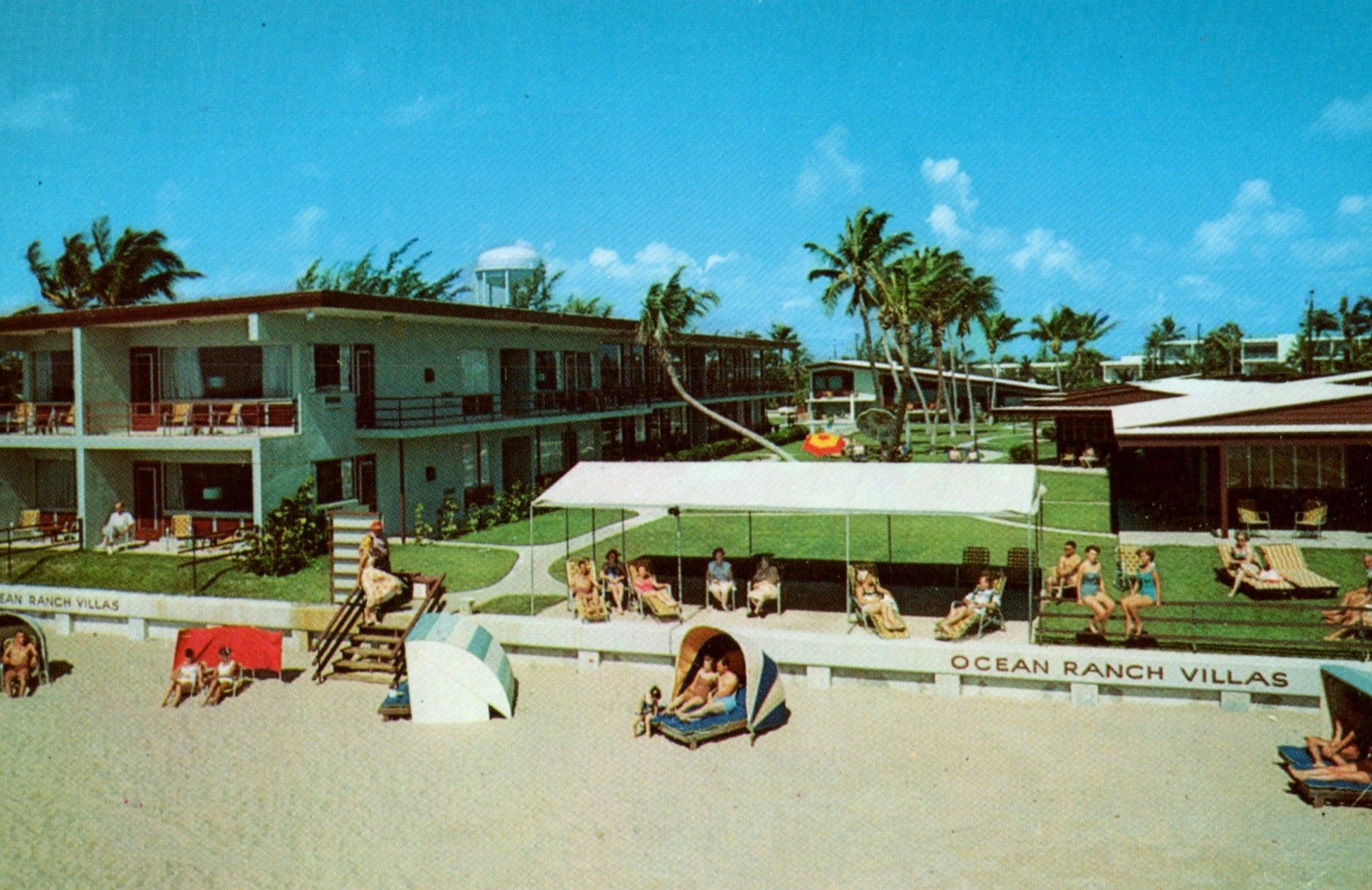 Pompano Beach Post cards: Caribee Villas [chrome]; Ocean Ranch Villas [chrome]; beach, boat docks, light house, all chrome