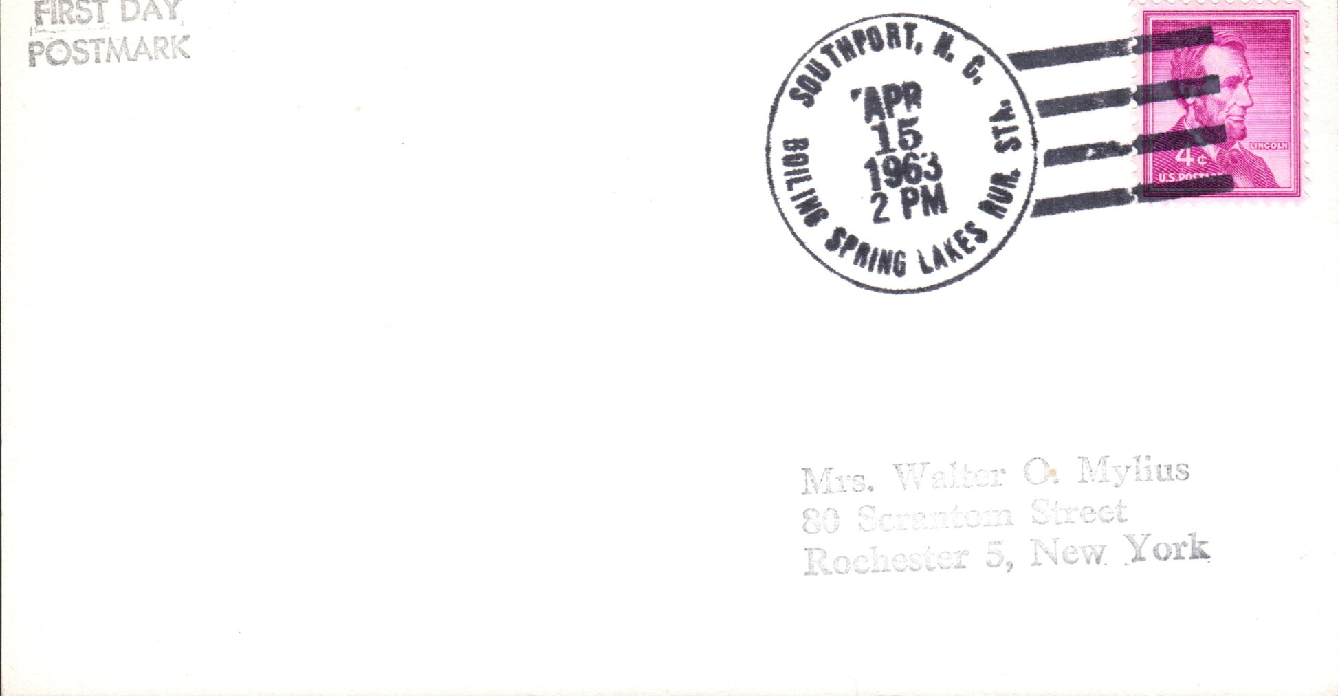 Boiling Spring Lakes RS (Southport) (1963-?) 1963 4-bar on cover-sized card, FD of Rural Branch, Clerk-in-charge autograph on back