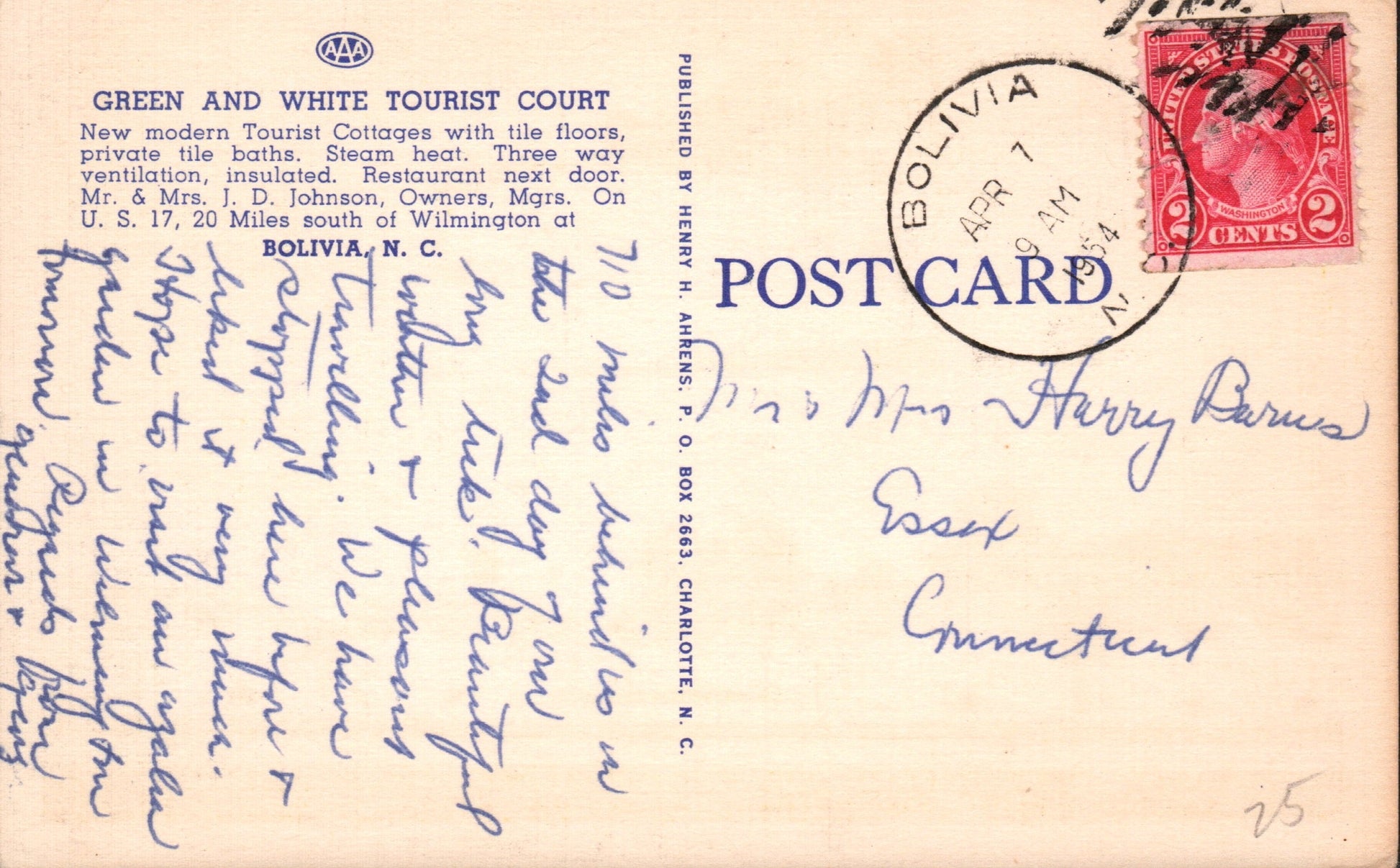 Bolivia 1954 duplex on post card, view of Green and White Tourist Court