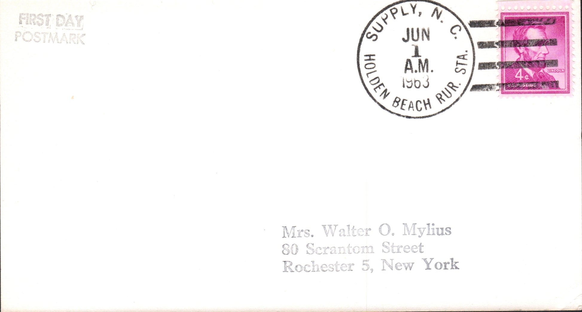 Holden Beach RS (Supply) 1963 4-bar on cover-sized card, FD of Rural Branch, round dater on back