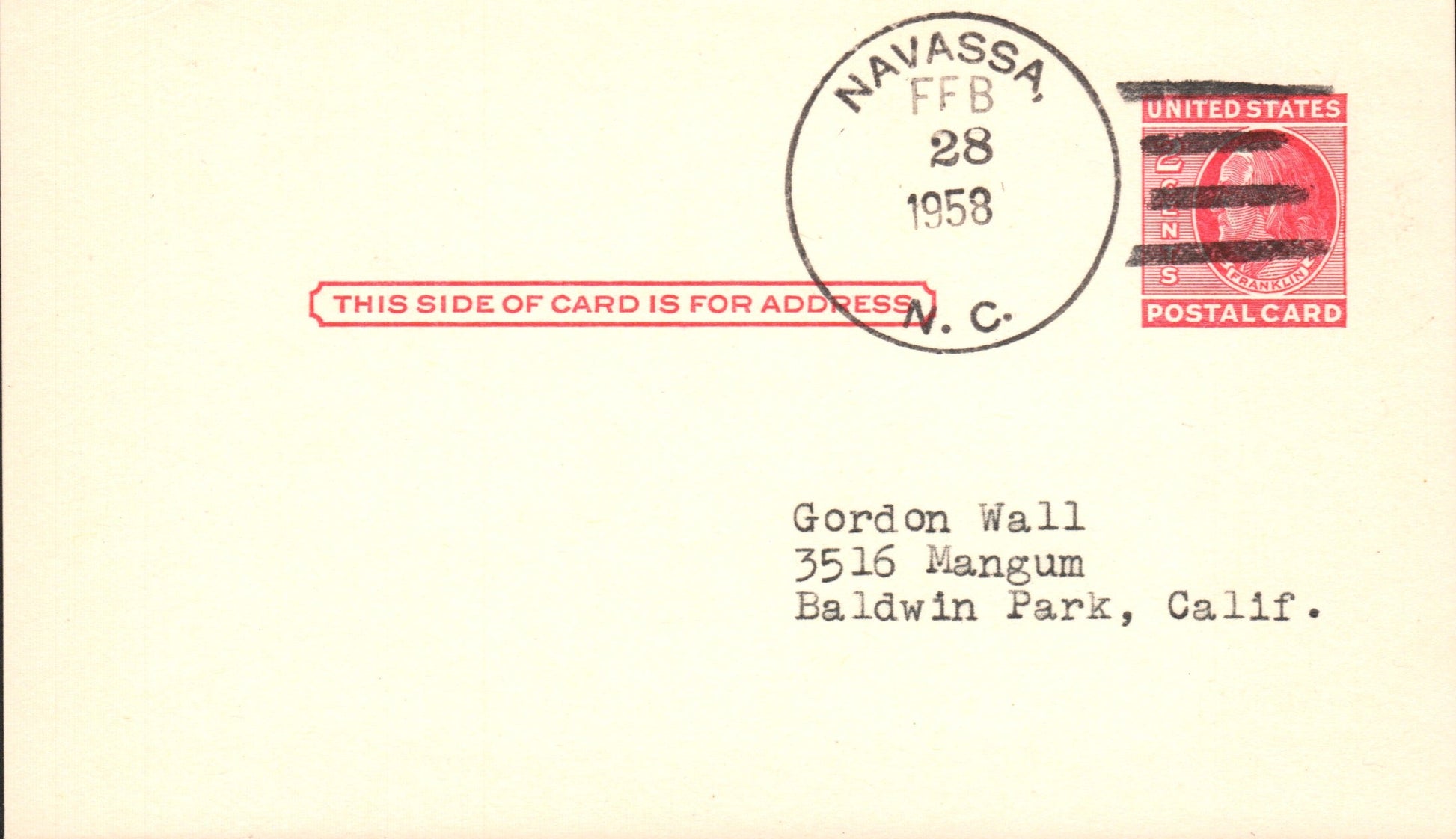 Navassa (1916-1958) 1958 4-bar on LD Postal Card