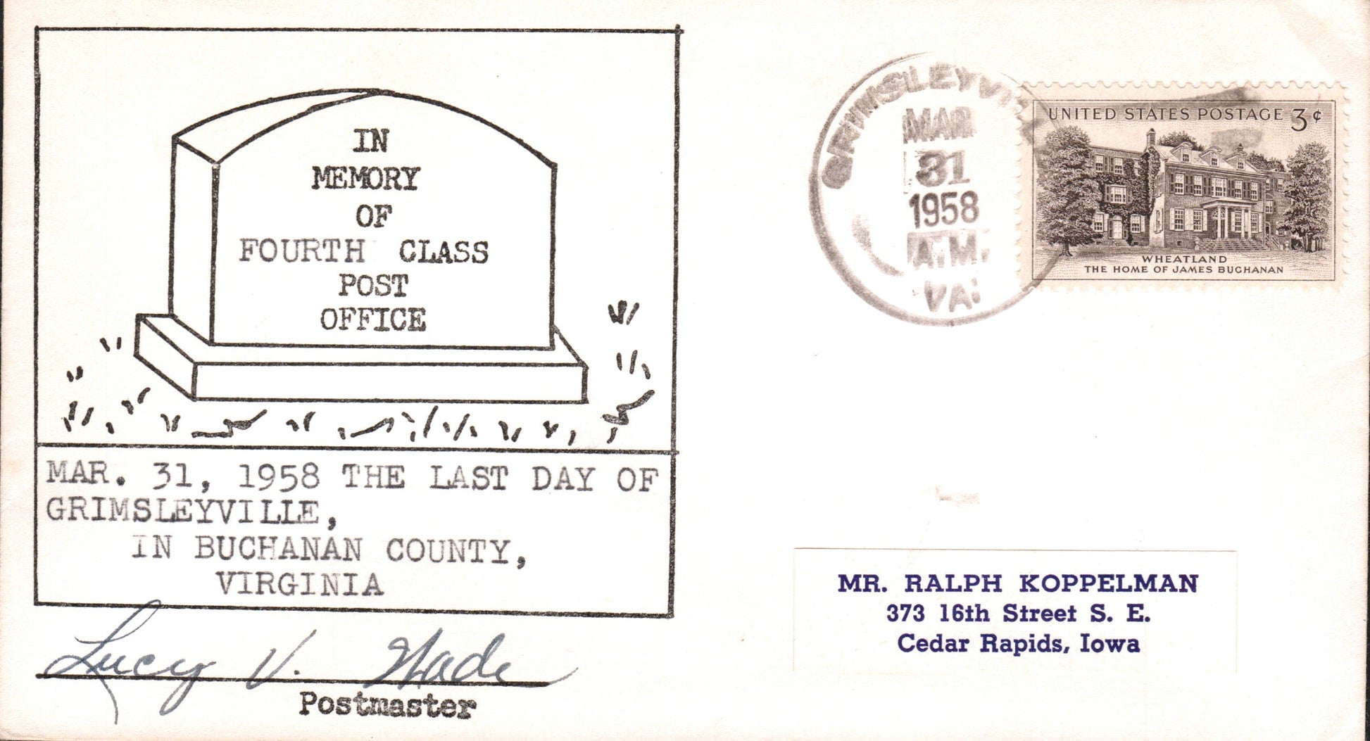 Grimsleyville (1934-1958) 1958 4-bar on cacheted LD cover, PM autograph; 1958 round dater on LD Postal Card